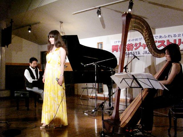 昨年に引き続き聖ペテロ教会に登場した北浪良佳、今回は林正樹(p)と掘込綾(harp)とのヴォーカル・ユニット。林正樹と掘込綾のお二人は北浪のセカンド・アルバム「SONGS」(VACV-1052)で共演し、そのときの感触から聖ペテロ教会に最もふさわしいメンバーとして今回のステージが実現した。PAは使っているものの、声量のある北浪の声は生で響きわたる。先ずは<虹の彼方>のアカペラからスタート。