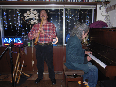 “風神雷神”は、2008年3月、ニューヨーク、イーストヴィレッジ<Drum>でデビュー。ジャンベの藤川清とのユニット。藤川はベルリン在住。CD『アフリカ』は、2010年に発売開始。あっという間に1000枚を完売。ジャズ・ビヨンドのボーダーを疾駆する。