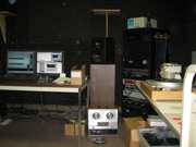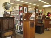 ![]() マー・サウンド・アーカイブの部屋に入った所。 年代物の蓄音機が並び、奥がLP コレクションの棚。 |