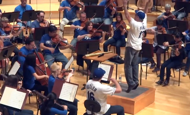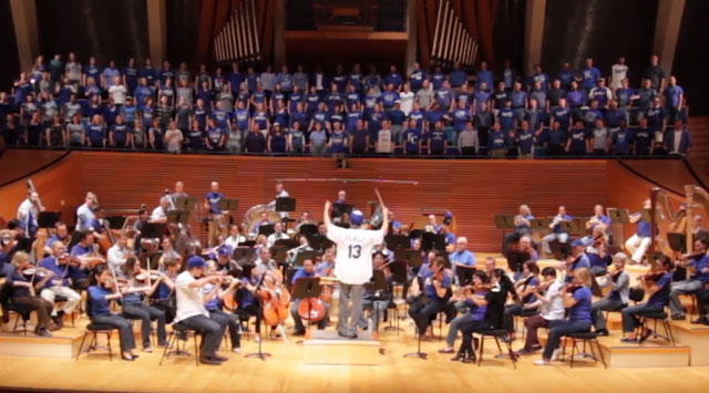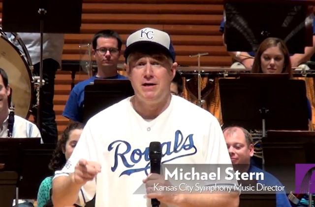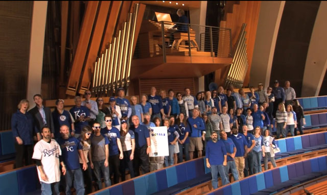 カウフマン・センターのヘルズバーグ・ホールはカンザス・シティ・シンフォニー(KC シンフォニー)の本拠地である。オーケストラの総ディレクター、マイケル・スターン氏(ヴィオリニスト、アイザック・スターンのご子息)が「へイ、KCスポーツファン!僕達はロイヤルズ・フィーバーにかかっちゃったよ!僕達は29年間これを待ってたんだ!Go ロイヤルズ!」というコメントに続き、オーケストラメンバー達が次々に「Go ロイヤルズ!」のかけ声で登場。KCシンフォニーのオーケストラとコーラス隊が、同じ曲<Take Me Out〜>を演奏し唄っているのだ。