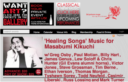 1973年にニューヨークに拠点を移して以来、マイルス・デイヴィス(tp)、ギル・エヴァンス(kb,cond)とのコラボレーションや、ゲイリー・ピーコック(b)、ポール・モチアン(ds)と共に新たなジャズの地平を切り拓いてきた菊地雅章は、ニューヨークのジャズ・シーンでも、孤高の存在として高い評価を獲ている。その菊地は、長年患ってきた肺疾患が悪化し、この7月から10月半ばにかけて、ニューヨーク市内のマウント・サイナイ病院での療養を余儀なくされた。菊地の治療費の一助にという趣旨で、ヴィレッジ・ジャズ・シーンの名物プロデューサー、ラス・ムストの呼びかけで去る9月27日、旧ヴィレッジ・ゲイト跡のクラブ「ル・ポアゾン・ルージュ」で、ベネフィット・コンサートが開催された。 |