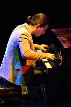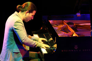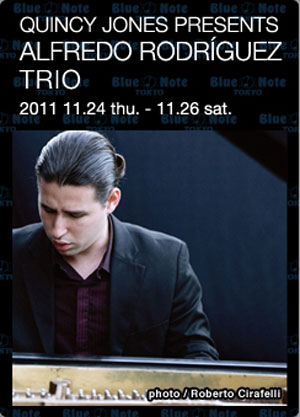 クインシー・ジョーンズが“いま最も注目すべき才能”と誉め称えたことで、俄然ファンの間で関心を集めつつあるピアニスト、アルフレッド・ロドリゲスがブルーノートのステージに初登場した。恐らくは初来日だろう。ハバナ(キューバ)生まれの26歳(1985年生)。貴公子然として見るからに品位と若々しい清々しさを印象づける白面のこのピアニストは、来日第一声となるオープニングの「Silencio」からしたたかな表現力を強く印象づける演奏を披露した。ベースはレイニエール・エリサルデ、ドラムスがヘンリー・コール。去る9月にニューヨークの「ブルーノート」でマッコイ・タイナーとステージを分け合っただけの実力の持主であることは、モティーフの基本となるリズミックな音型を徐々に活性化させながら、変拍子のラテン・リズムで燃え立たせる展開での辛口な表現からも察せられた。演奏にかける思いの強さは30分を越すこの1曲だけでもありあり。馴染みの深い2曲目もそう。こんな「キサス・キサス・キサス」は初めて聴いた。極端なほどのスローなボレロのまま、素性を明かさぬ神秘性を表に出した独特の世界に引き込まれていく。次の「Cu - Bop」でのエリサルデによるいかにもアフロ的な黒い情念を押し出したベース・ソロといい、続く「El Gude」でのキューバン舞踊を思わせる3者一体となった白熱的演奏といい、思わずハバナ郊外の黒人地区で体験したサンテリアの呪術的儀式が瞼に甦るほどにスリリング。アンコールはエルネスト・ドゥアルテが作曲したボレロの名曲でベニー・モレーの名唱が懐かしい「Como Fueコモ・フエ」。ロドリゲスのソロが夜のしじまを縫うように静けさの中を漂っていく。 |