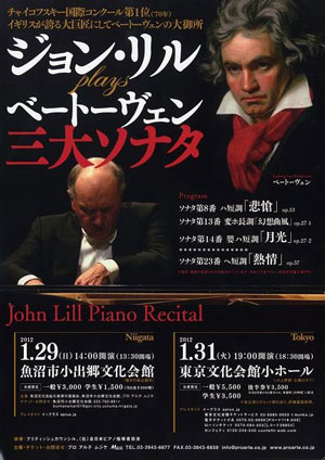 ジョン・リルといえばベートーヴェン、といえるほど、もはやベートーヴェン弾きとして押しも押されぬ存在である。キャリアはゆうに50年以上。1970年のチャイコフスキー国際コンクールの覇者であり、以来世界中で演奏してきた。レパートリーは驚愕するほど多く、コンチェルトだけでも70曲に及ぶ。母国英国では8つの大学から名誉博士号を受け、大英帝国勲章も2度受賞している。 |
