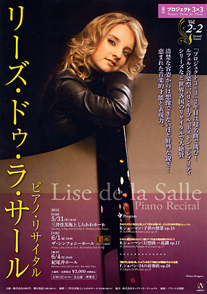 アマーティが2011年より始動させた、才能ある若きアーティストの変貌を3年にわたって追うシリーズ「プロジェクト3×3」。このリーズ・ド・ラ・サールも選ばれたピアニストのひとりで、1988年生まれ。9歳で初リサイタル、12歳でパリ音楽院をプルミエ・プリを得て卒業、と早くから天才として脚光を浴びた。世界各地のオーケストラと共演するほか、順調に録音も行っている。この日はシリーズの中間地点、2年目のリサイタルを聴いた。 |
