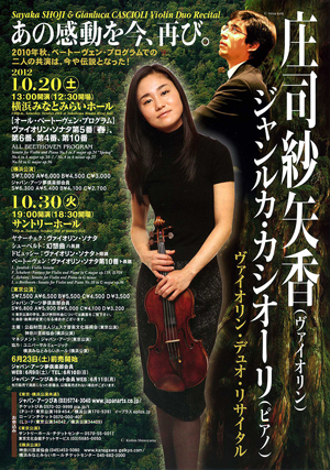 カシオーリの緩急自在、軽やかなピアノに、庄司の品格ある美しい音色のヴァイオリン。魅力あるデュオが、2010年に引き続き2度目の日本ツアーを行うというので聴きに出かけた。残念ながら前回は聴き逃したのだが、このデュオでほぼひと月をかけて全国17カ所を回る大ツアー。人気のほどがうかがえる。 |