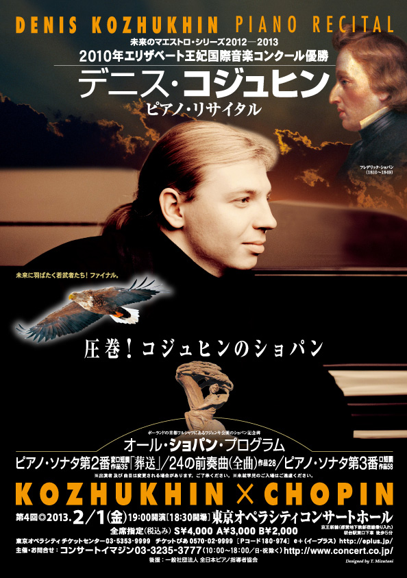 2010年のエリザベート・コンクールの覇者、デニス・コジュヒン。20代の後半を迎えたばかりであるが、独自の研ぎ澄まされた音楽世界は確立し、すでに風格さえ漂いはじめている。今回の来日の目玉であるプロコフィエフのソナタ全演奏を終え、この日はショパンの2曲のソナタのあいだに24の前奏曲を挟みこむという、オール・ショパン・プログラム。たいていの演奏会では、前奏曲はプログラムの後半か前半のどちらかにまとめて据え置かれるが、12曲ずつで区切って配するあたりが少々風変わりである。そして、途中で中断されても全体を貫くテンションや世界観は損なわれぬ−−−その自信を逆証明する形ともなっていた。