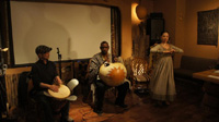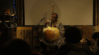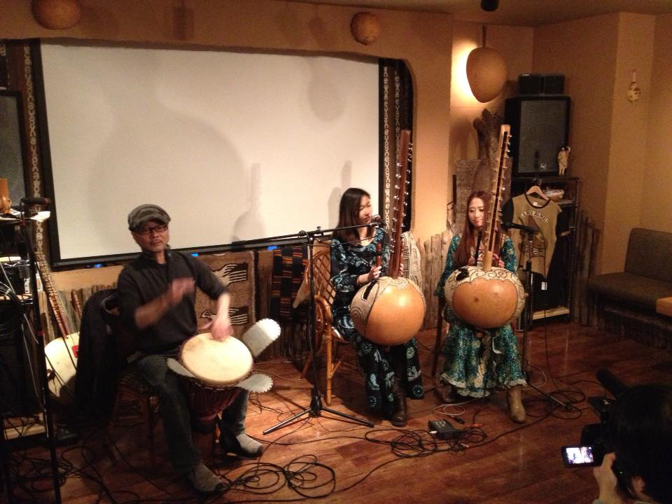 そして再び音楽。若く美しきコラ・デュエット、Ninye Munye (ににぇむにぇ:永末智子(ながすえともこ)=コラ、杵渕ちひろ=コラ、ヴォーカル)の演奏。永末は2011年、2012年と2年続けてマリでのコラ・ワークショップに参加した勉強家で努力家。今回は寺崎卓也のジェンベとの初コラボ、なんとこれもリハなしのいきなり本番。一見無謀にも思えるこんな初顔合わせ同志のリハなしセッションが、何の違和感なくまとまってしまうのは、皆どこかアフリカ的なおおらかな器が備わっているプレーヤーだから、だろう。2曲目では、客席とのバンバラ語によるコール・アンド・レスポンスが加わり、気分が乗じたマリ大使館の外交官からワリ(おひねり/チップ)が渡される一幕も。