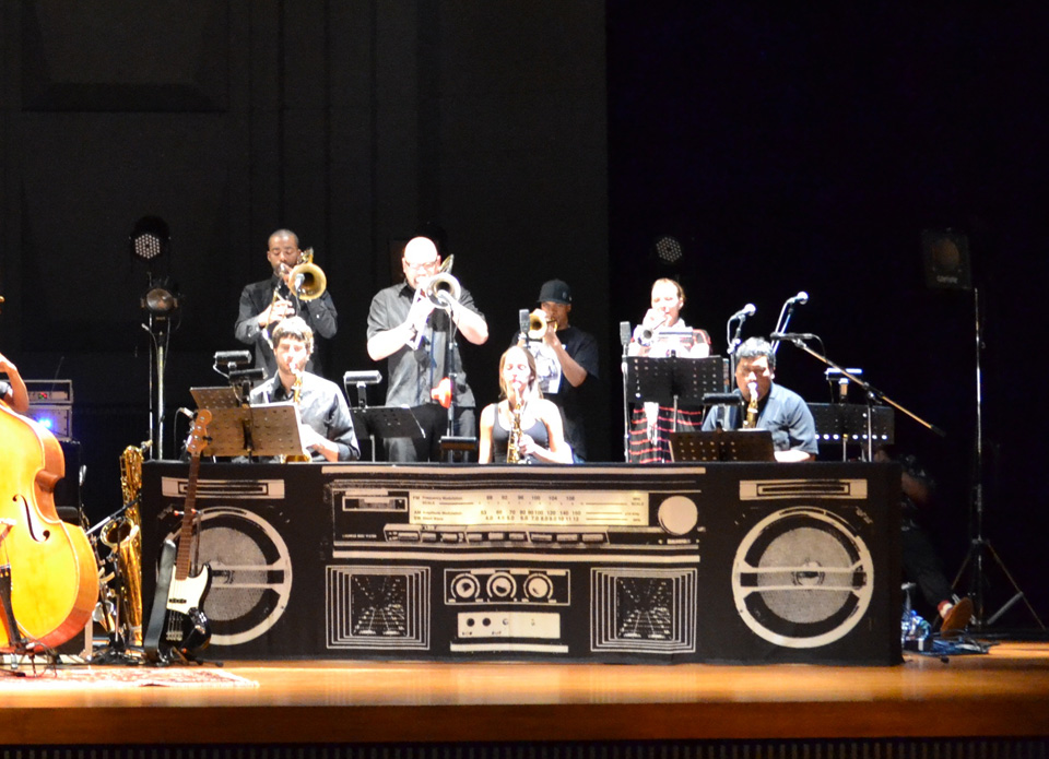 開演前のオーチャードホール。「ラジオ・ミュージック・ソサイエティ」ツアーなだけにステージ右側にあるラジオ、実際にはミニコンポのような大きな幕が目を引く。ミュージシャンたちが現れると、その幕の後がトランペット2、トロンボーン2、サックス3の7管編成ミニ・ビッグバンドのブラス・セクションの場所であることがわかる。チューニングの混沌からやがてサド・ジョーンズの「Us」が始まり、途中からエスペランサが登場してエレキベースを持ち、最初はMCをしながらおかず風に、次いでファンキーなラインを弾く。その上で管楽器がソロをつないでいく。2曲目「Hold on Me」をしっとりと歌い上げながら、ブラス・セクションが徐々に色彩とストーリーを紡ぎ始め、やがてベースソロが美しく歌い始める。そして「ブラス・セクション」がラジオのような効果を果たし、エスペランサを含むリズム隊とインターアクトしていくという構図が見えてくる。