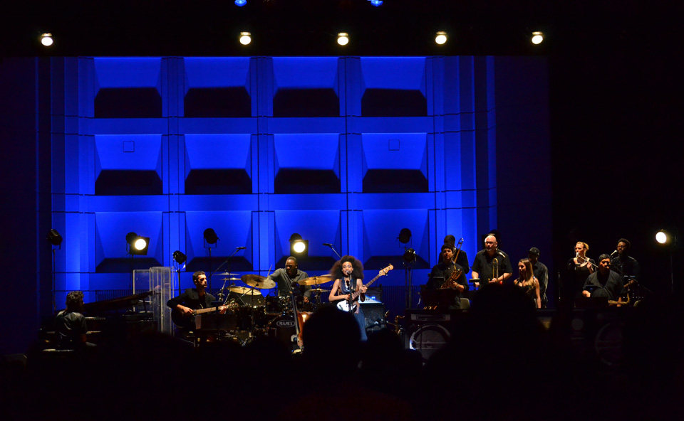 演奏された曲は、最新作「Radio Music Society」から大きく順番を変えながら8曲、それにアンコールという構成。聴いていくうちに、エスペランサの凄さのひとつの表れは卓越したアレンジ能力だと気付く。ビッグバンドに合わせて歌うシンガーではなく、自分の歌を包むサウンドを自由にデザインしていく。これまでにない他の誰でもない独自の音楽とその時間と空間を生み出すオリジナリティがあり、ブラスやストリングスをも含むアレンジとサウンドデザインに恐るべき才能がある。