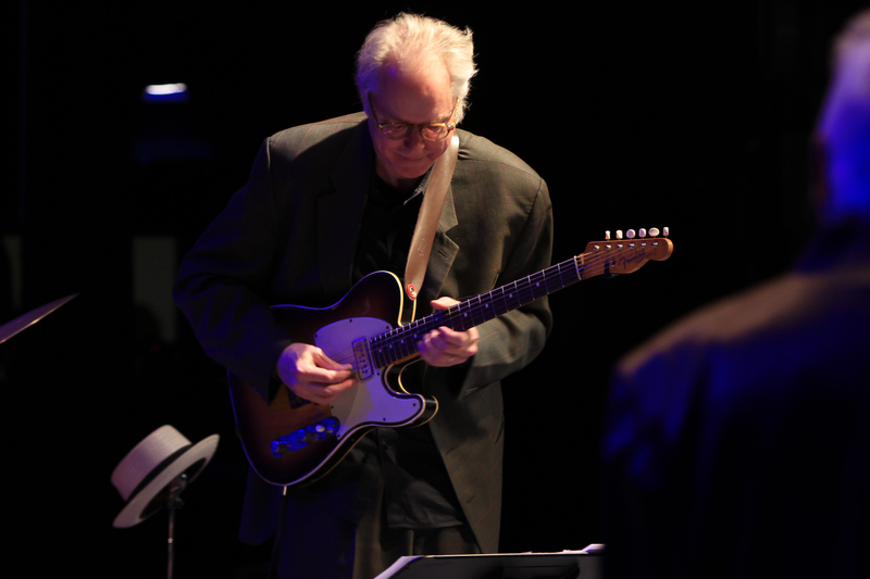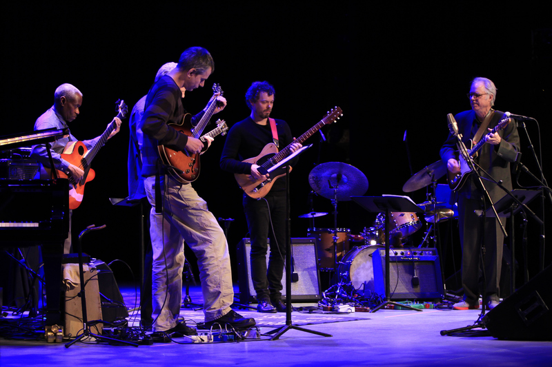 モチアンのリーダーとしての最後のアルバムとなった『ウィンドミルズ・オブ・ユア・マインド』(Winter&Winter)のオープナー/クローザーとして収録されていたワルツ曲<イントロダクション(ラメント・フォー・ギター)>の4ギター+1ベース・ヴァージョンがギター・テーマとして演奏された。モチアンのギター愛好癖についてひと言ふた言口にしてからフリゼールがソロでイントロを演奏したが、私にとっては言葉や作曲を超えて奥深いところで響き合うこの演奏が当夜のもっともマジカルな瞬間であった。他のギタリストたちが登場してもフリゼールがかけた魔法は続いており、静かにそして慎ましくといってもよいほど個が全体に寄与しており、これが聴衆を恍惚状態に捉えて離さないのである。