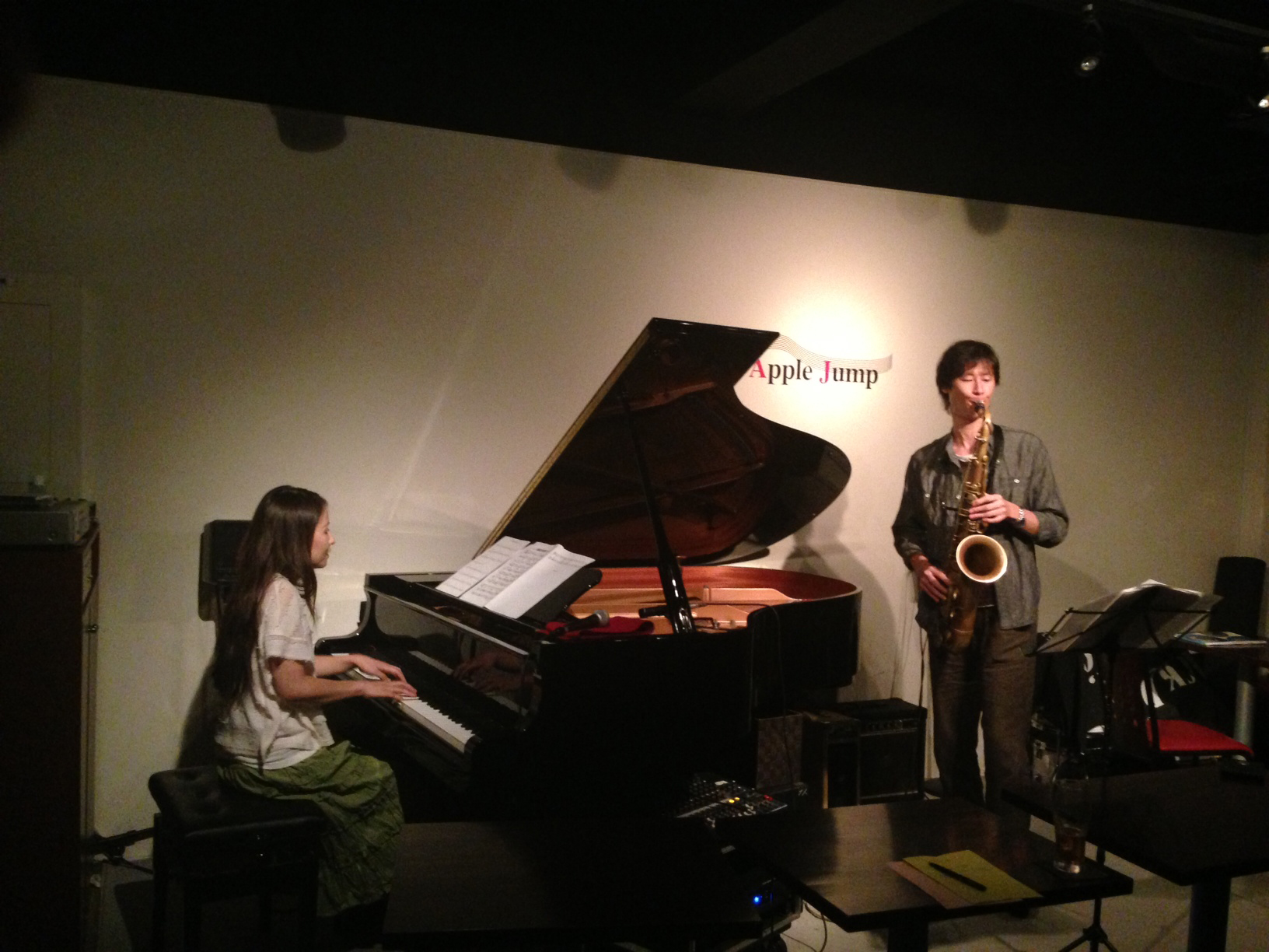 池袋・立教大学キャンパスからわずか20mほどにあるシンプルで居心地のよいジャズクラブ「アップル・ジャンプ」。初めて聴く二人でのライブは期待していた以上に素晴らしかった。前半は橋爪の作品3曲にビル・エヴァンス、そして『西山瞳/Music in You』(Meantone Records)に西山、佐藤、池長、橋爪で録音されている<Pictures>へ。後半はフレッド・ハーシュ、カーラ・ブレイ、スティーブ・スワローなど個性的な作曲家の曲を取り上げながら、西山の曲で締め括る。作曲に力を入れ魅力的な曲を書き続けてきた二人。特に西山は2010年に米最大規模の作曲コンペティションであるインターナショナル・ソングライティング・コンペティション(ISC)で、全世界約15,000エントリーの中から<Unfolding Universe>がジャズ部門3位を受賞している。二人のオリジナル曲から生まれる世界観は素晴らしく、お互いの曲を理解しているだけにさらに広がりを見せる。西山の美しくも緻密なピアノフレーズが生み出す確かなテクスチャーに、橋爪の簡単には捉えきれない、だが自分自身の明確なイディオムを持ち、独特の空気感があるテナーが静かに絵を描いていく。強いて言えば、楽器の特性上しかたがないことだが、橋爪の作品に対する西山の理解の方が、西山の作品に対する橋爪の理解よりも深いかも知れない。西山の作品でのさらに踏み込んだ橋爪のプレイにも期待したい。