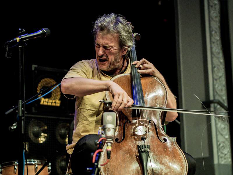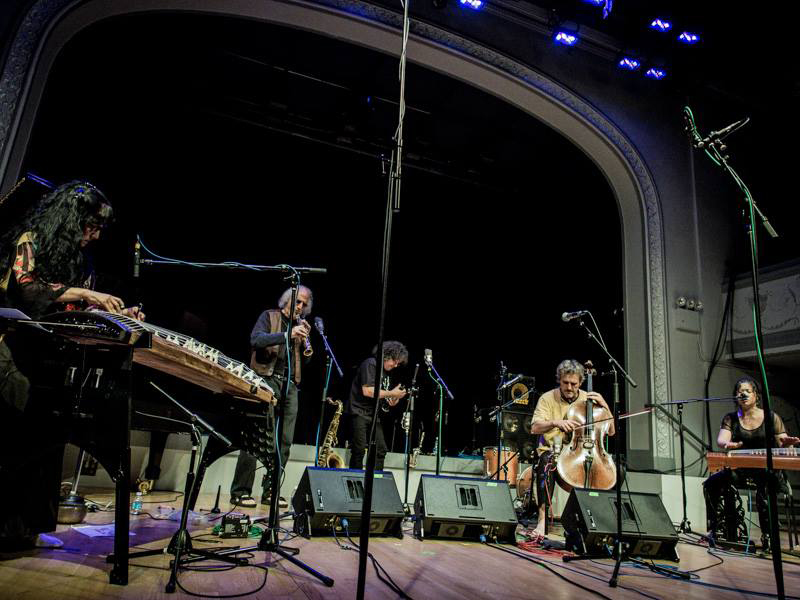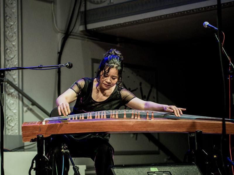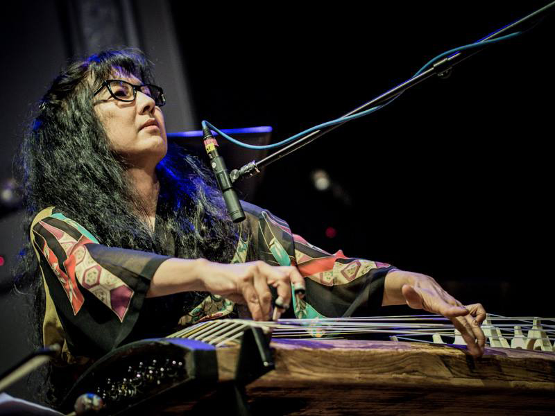 次のふたつのセットは“フレンチ・アメリカン・コネクション”というテーマでくくられ、今年のフェスティバル全体を通したハイライトとなった。最初のアンサンブルは「イースト=ウエスト・コレクティヴ」で、編成は、ラリー・オックス(sopranino,ts)、シルヴェイン・カサップ(cl)、ディディエ・プチ(cello,voice)、シュウ・フンシャ(古箏,voice)、ミヤ・マサオカ(箏)の5人。