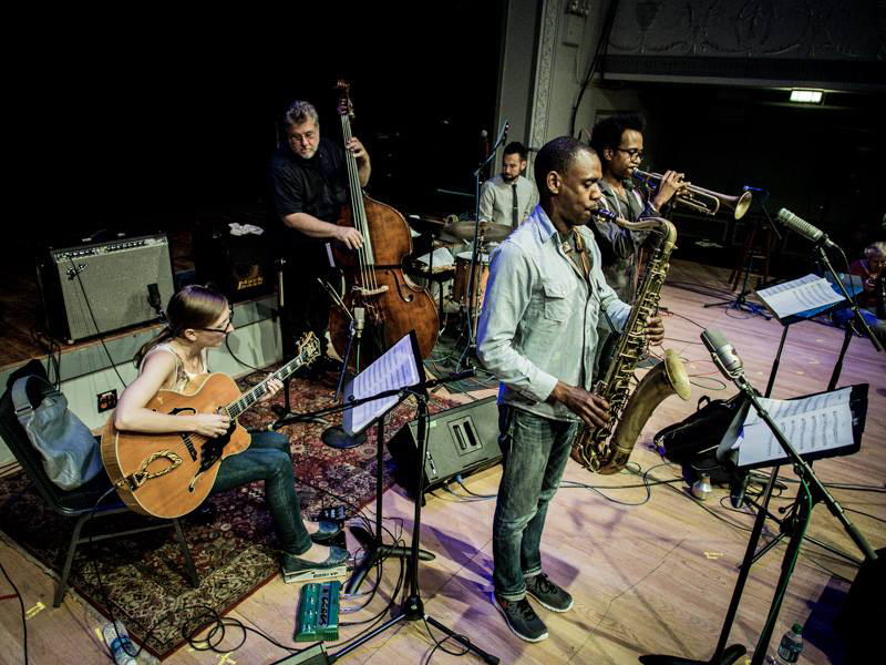 オープナーの<リネッジ>でトーマスは、2本のホーンに合わせて長く流れるようなラインを吹かせ、その下で、ギター、ベース、ドラムスに複雑によじれたラインを演奏させた。ギターのメアリーは、譜面通りの演奏とともに流れを分断するようなさまざまな断片的なフレーズを挟むというふたつの役割を担っていた。テナーのブライアン・セトルズとトランペットのジョナサン・フィンレイソン(スティーヴ・コールマンのバンドに在団)は印象深いソロイストだった。セトルズ氏は1曲目でトレーン的な力強いソロを吹いてバンドを沸点までヒートアップさせた。2曲目は、リズム・チームがゴースト・トランス的なフィギュアをリピートさせるリズム・パターンの上で、ホーンプレイヤーがベント・ハーモニーを演奏する。表面はもの静かだが、中では何かが進行しているというやり方。3曲目では、リズムが絶えずテンポをアップ・ダウン変化させる上でホーンプレイヤーがくぐもったラインを奏していく。