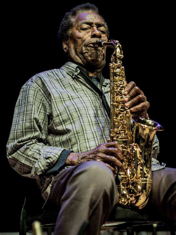 当夜の、またヴィジョン・フェスティバル 18の最終セットは、「マーシャル・アレン&ザ・マクブライズ・ベース・ルーツ」であった。このユニットは、長らくサン・ラ・アーケストラのリーダーを務めた、アルト・サックスとEWI(アカイ製ウインド・シンセサイザー)のマーシャル・アレンと3人のマスター・ベーシスト、リー・スミス、息子のクリスチャン・マクブライド、それにハワード・クーパーという編成。この編成はユニークに見えるが、じつは、かつてヴィジョン・フェストとヴィクト・フェストに3人のベーシスト+チャールズ・ゲイルという同じ編成のユニットが出演したことがある。僕は、ここでの3人のベーシストが共演するやり方が好きである。時に3者が一斉に弦をかき鳴らしたり、時には弓を使ったり、一斉に、あるいは交互に演奏するのだがつねに心が通い合っている事実。マーシャル・アレンは来年90才を迎えるが、現役のなかでもっとも創造的で特徴が際立ち、力強いサックス奏者のひとりである。