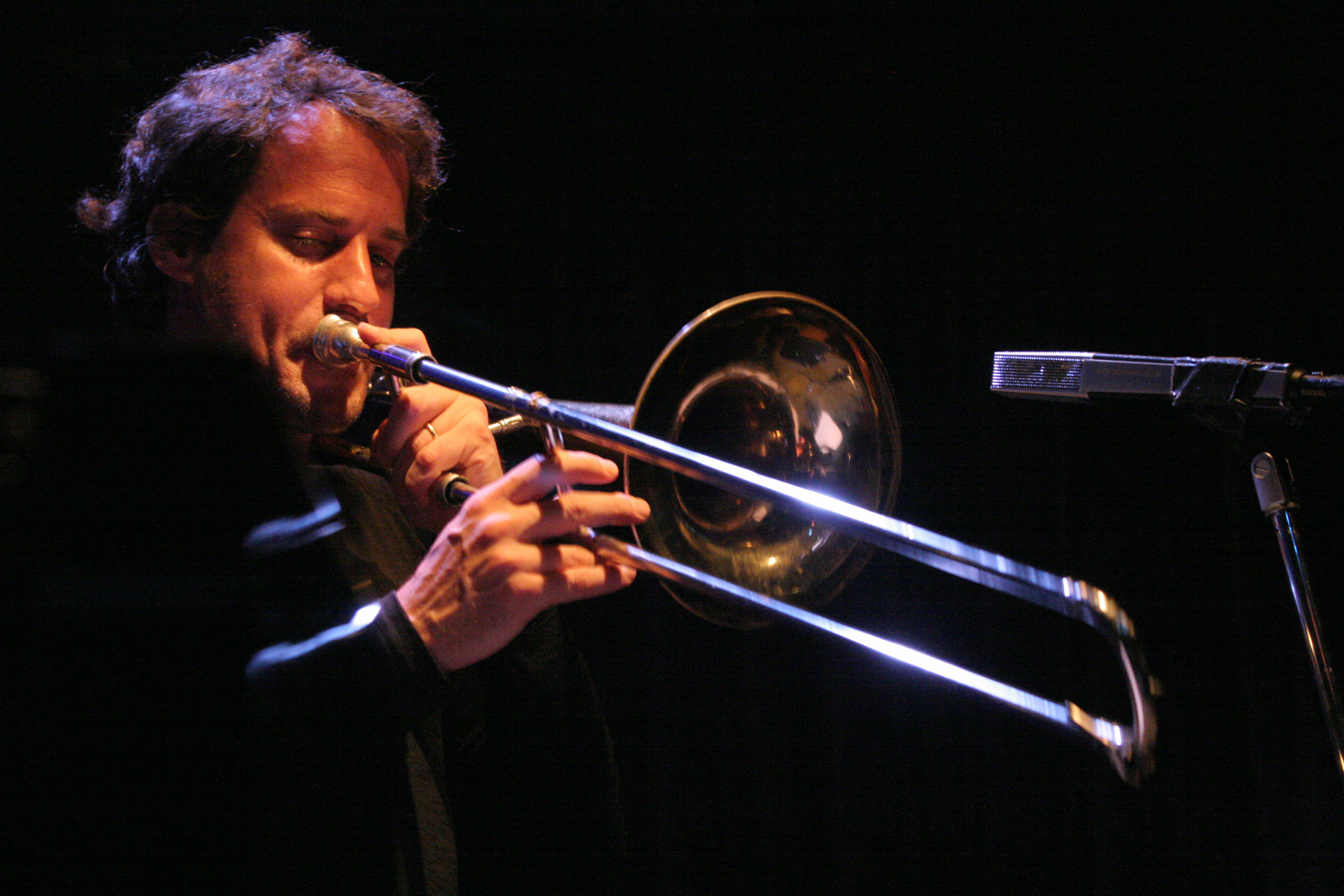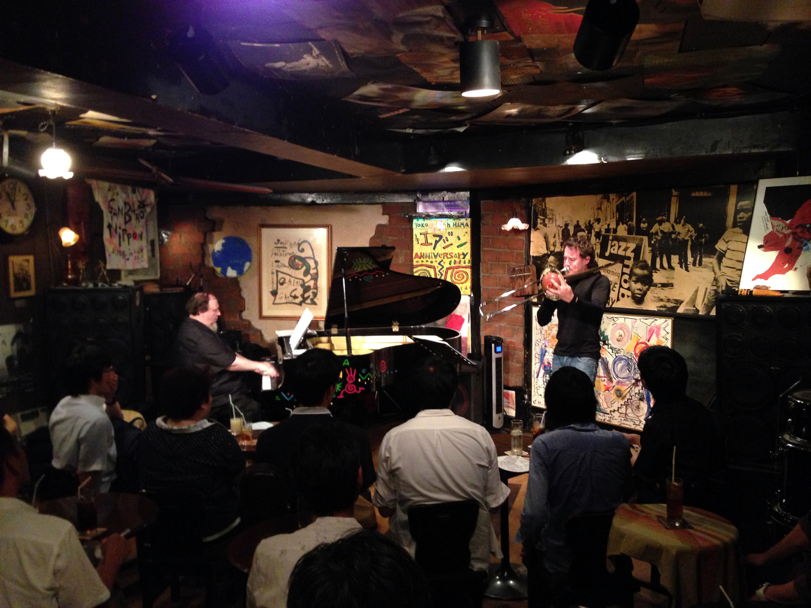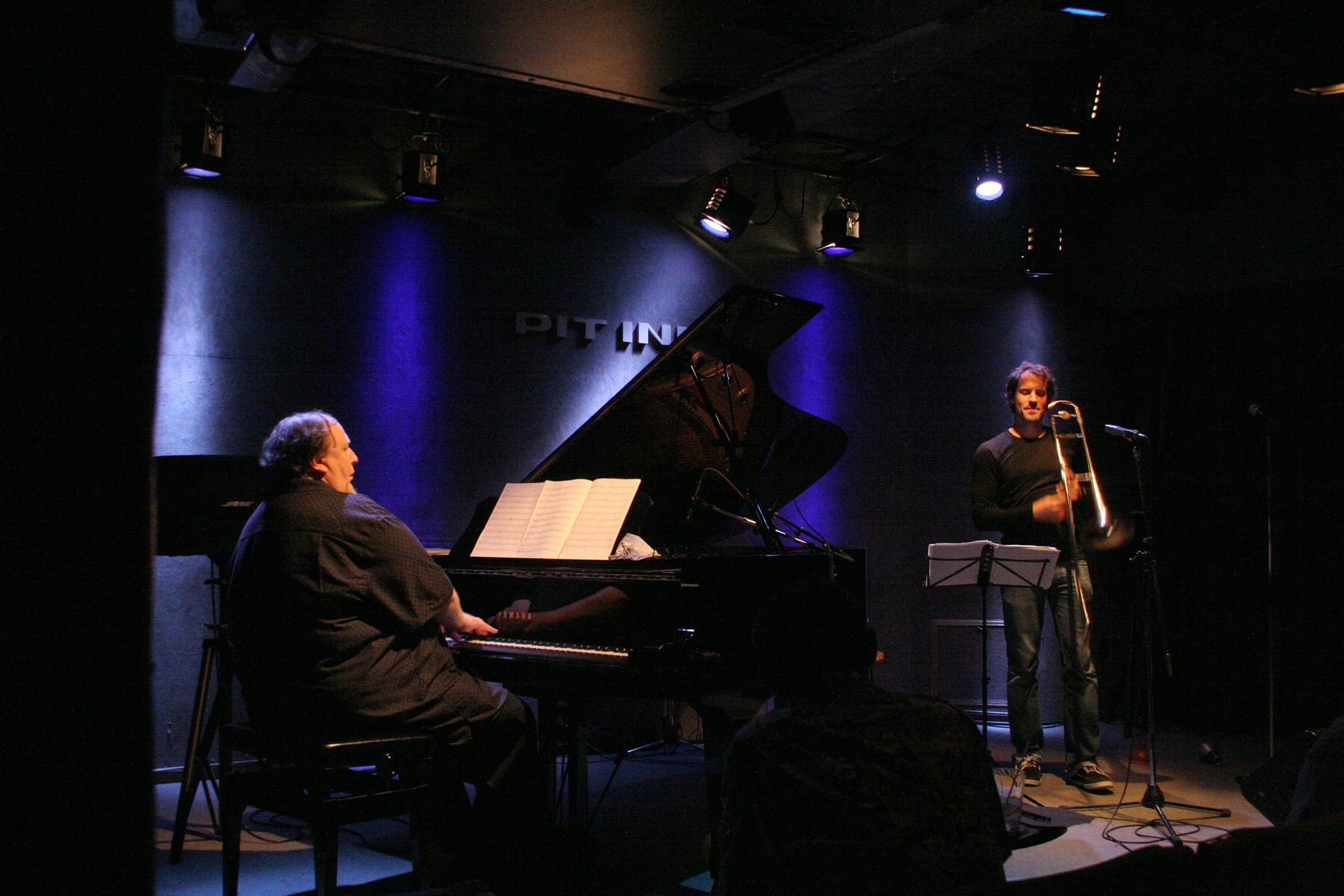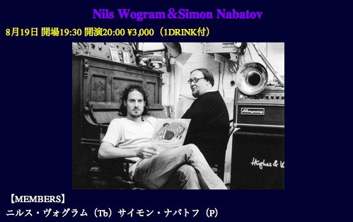 それにしてもサイモン・ナバトフ(1959~、モスクワ)、オフ・ステージの巨体を持て余しただらけ気味の中年親父が、オン・ステージでの豹変ぶりはどうだ。眼鏡を外し、イケメンのニルスとまなじりを決して対峙する意気込み!十数年のキャリアを誇るデュオが“日本のジャズの聖地”新宿ピットインで初心に帰ったようだ。こういう演奏をアメリカでは“フリー・バップ”というのだろうか?シンプルだがテーマがあり、アドリブを展開するのだが、それなりにキメもあり、オンとオフを往き来しつつ、テーマに戻って締める。トロンボーンとピアノのデュオ、異色のようだが音楽の三要素、メロディ、ハーモニー、リズムをカバーできる。とくにニルスはマルチフォニックス(重音奏法)やサーキュラー・ブリージング(循環呼吸法)も含めて(この夜は控えていたが)多彩なテクニックを有しているので誠に表現力に富む。ユニゾンで歌ったり、カウンターメロディをぶつけ合ったり。長いキャリアのふたりだけに、やや手慣れた感を覚える場面もなくはなかったが、会話を交わすように自由自在に楽器を操り音楽を話すふたりの魅力は絶大である。