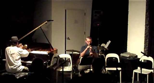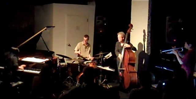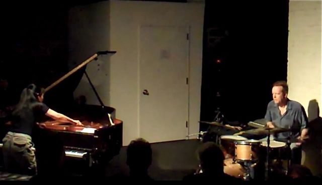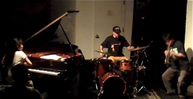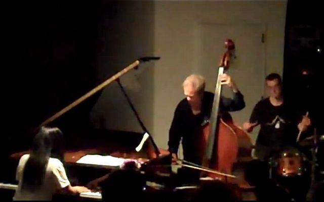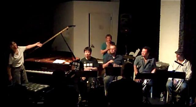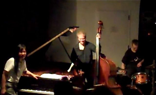 田村とドラムのジョン・ホーレンベックとのトリオ、Junk Boxは2枚のCDをリリースしている長命バンド。ジョンは彼のビッグバンドでグラミーにもノミネートされていて、コンポーザー、リーダーとして有名だが、ドラマーとしての彼もとにかくすごい。小物の使い方も見事。Junk boxは音楽が音符というクラシックな記譜法よりは、その音楽のムードを決めるような方法のほうがより音楽の方向性を決定づけられるという発想のもとに、私が名付けたcom-improというあらかじめディレクションを決定しているインプロヴィゼーションで演奏。言葉だったり、表だったり、グラフィックだったりする譜面での音楽は何を演奏するかは演奏者の自由だが、その方向性はあらかじめはっきりしている。ジョンはベルリンの大学で教えている事もあり、最近はヨーロッパでのこのバンドの演奏チャンスも増えたが、この日のJunk boxは間違いなくこのバンドでの今までのベストの演奏だった。