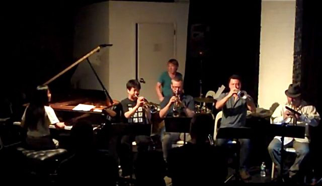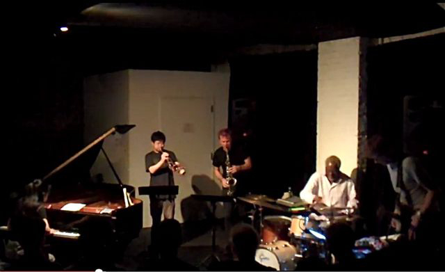 ついにレジデンシー最終日。今まで大満足、大成功で進んで来て、もう気分は最上!このセットはKAZEのコンセプト延長バージョン。4人の希有なトランペットにドラムとピアノ、ピアノをパーカッションと捉えて、ブラス&パーカッション・アンサンブルと名付けた。トランペットは今回初めて共演するネート・ウーリーも含めて、皆楽器の音を超えたエクステンデッド・テクニックという意味でも傑出した4人。インプロ、このために書き下ろした田村の新曲も含め、もう誰が何の音を出しているのか演奏している本人もわからないような共演。全員が表現しているのに、それが個々の声ではなくひとつの音楽になるという感覚は音楽家としては、最高に気持ち良い。