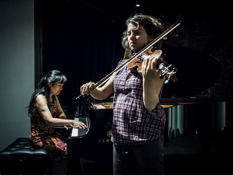 最初の大編成とは打って変わって、バイオリンのカーラ・キルステットとのデュオ・ユニットMinamoのセット。このユニット結成は、サンフランシスコでのRovaサキソフォン・カルテットとのプロジェクトをきっかけにしている。Rovaのラリー・オックスがRovaの大編成コンサートでこのデュオのセットを組んでくれた。カーラとは会った事もなかったけれど、事前に送ってくれた音を聴いてすぐにうまくいくと判っていた。初演から今まですべてインプロヴィゼーションで演奏しているユニット。ふたりともとりとめのないインプロヴィゼーションというのはいやで曲にしてしまう傾向があり、結果、とてもインプロヴィゼーションとは思えないような楽曲に仕上げてしまう。サンフランシスコでの初演のあと、オーストリア、ウェールスのフェスティバルで共演。聴いていた、サンディエゴのボニーが彼女のレーベルからリリースしたいと申し出てくれて、サンフランシスコとウェールスのコンサートはデビューCDともなった。さらに気があった私たちは、カナダのバンクーバーやニュージャージーでも共演を重ね、ジョン(ゾーン)のレーベルTzadikからもバンクーバーのコンサートとスタジオ録音の2枚組がリリースされた。昨年、マサチューセッツで共演したが、私たちはいつも始まるまで、「どうなるんだろうね…」なんて話しながら演奏する。演奏を始めるとどこか響き合うものがあり、親友との夜中の会話のように、話は弾み、自分でも意識していなかった自分の音が出てくる。この晩はこのセットもまるでマジックのようだった。