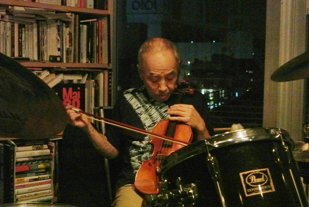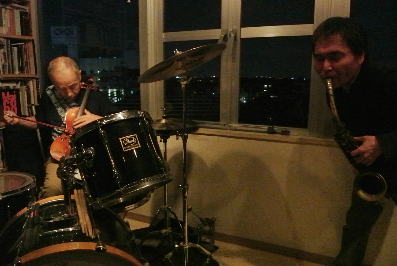 ドラムの醍醐味はスピード、フリーのドラムは4ビート以上にスピードが演奏の鍵をにぎることがしばしばあるが、この夜のSABU豊住のプレイはドラムもしかり、ヴァイオリンも二胡もスピード感に満ち溢れていて居合わせた客全員にジャズのグルーヴをふりまいてくれた。