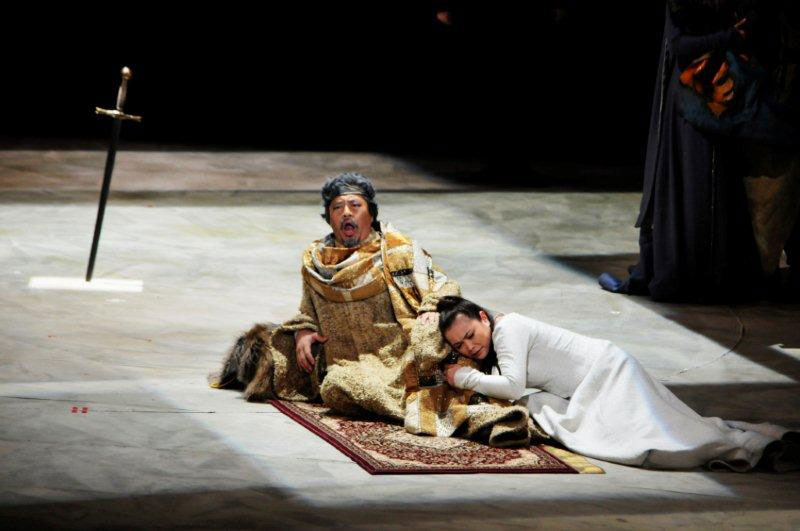 このあたりの音楽と台本は非常に秀逸で、錯綜する物語を淀みなくドラマティックに語り、固唾をのむ迫力である。王者の威厳を漂わせていたリア(小鉄和宏)が次第に狂気を募らせ零落していく様子、王を救うべく立ち上がったグロスター(大久保光哉)が陰惨な私刑で失明し、息子の裏切りを知り、荒野をさまよう中で自殺を企てる過程が、胸を衝く音楽と歌唱で見る者の心に迫ってくる。ゴネリル(板波利加。悪女役はもはや堂に入ったもの)がエドマンド(大澤一彰。声量・声質ともに存在感あり)を誘惑し、父を救うべく聖女のような白一色の装いに銀の鎧をまとうコーディリア(日比野幸。硬質な清純さをよく表現している)が、一つの舞台で同時進行する、その音楽の融通無碍の変化には感嘆。また演出も、色彩と光、シンプルな装置を巧みに用いて、鮮やかにこの対比を示してみせる。