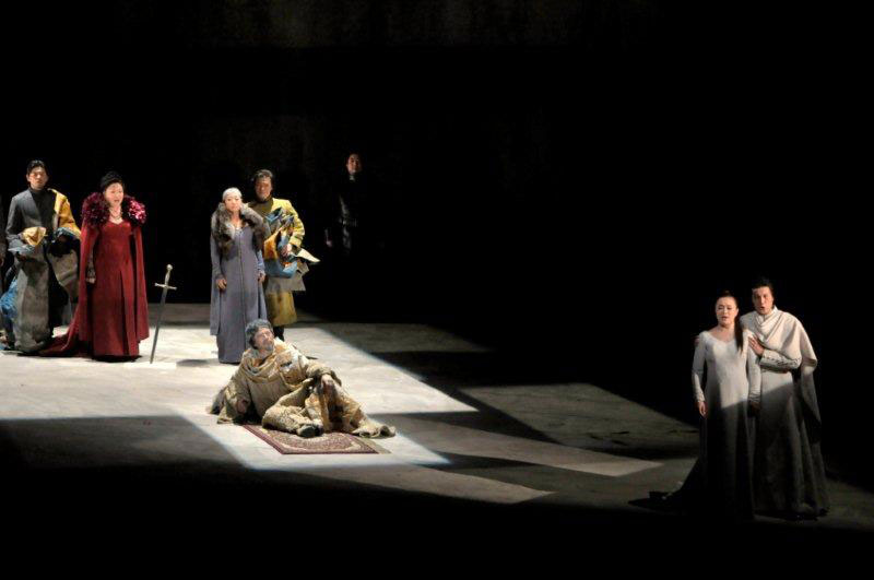 第2部6場、リア王がついにコーディリアと再会し、狂気のうちにではあるが、つかの間の平和な時を過ごす。非常に印象的で忘れがたいシーンである。眠るリア王の傍らのコーディリアは、さながら、十字架から死んで下ろされたイエス・キリストを抱く聖母マリアのよう。この安らぎが本物ではなく、後に流血の悲劇が到来することを、暗示している。静謐だが底流にひりひりとした緊迫感を孕む音楽が、一幅の絵のような演出と共に、強烈な印象を残す。