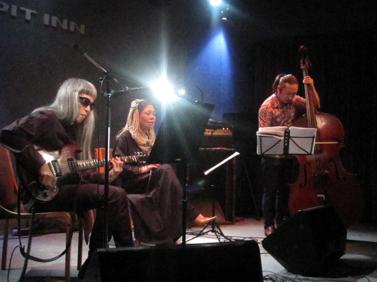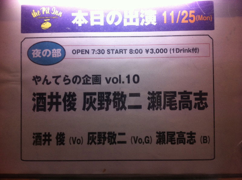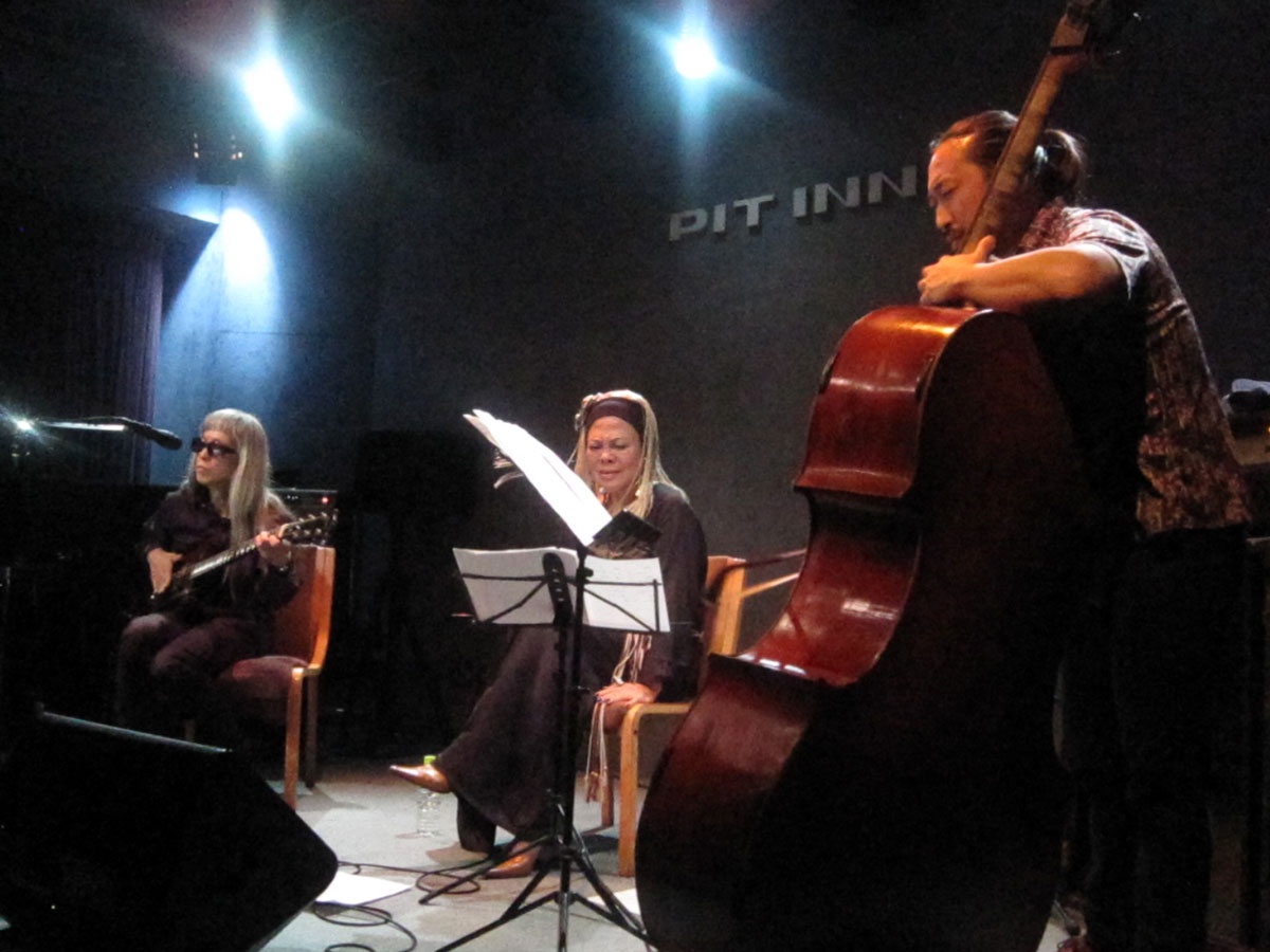 昨年、灰野敬二と外山明(ds)、吉田隆一(bs)それぞれとの初共演デュオ・ライヴを企画したやんてら氏の新規企画。氏にとって初の新宿ピットインで、正統派ジャズ・シンガーの酒井俊と前衛ロックのベテラン灰野敬二を共演させる、というアイデアをどこから得たのか訊いてみたいところ。実は筆者は酒井俊がどういうアーティストなのか知らず、最初はてっきり男性だと思い込んでいた始末。77年にレコード・デビューし「伝説のヴォーカリスト」と呼ばれる酒井は、一時期音楽から離れていたが、1989年の復活以来精力的に活動し、近年は即興演奏・民族音楽・トラディショナルへの傾倒を見せている。若いときから三上寛と灰野に憧れていたらしく、灰野との共演歴もあるサックス奏者の林栄一と「だいだらぼっち」というユニットを組んだり、スガダイロー(pf)や今堀恒雄(g)といった先鋭的な演奏家と共演したりしているので、オーソドックス一本やりの歌手ではないことが窺える。ベースの瀬尾高志は板橋文夫(pf)、高瀬アキ(pf)、林栄一(as)、千野秀一(pf)、スガダイロー(pf)、高岡大祐(tuba)、吉田隆一(bs)等数多くのミュージシャンと共演する34歳の実力派。どんな演奏になるか予想のつかない組み合わせである。