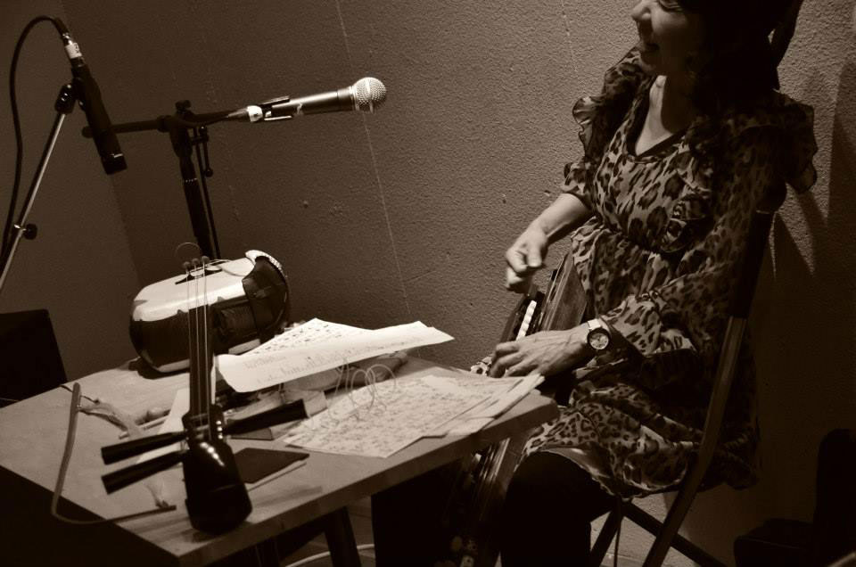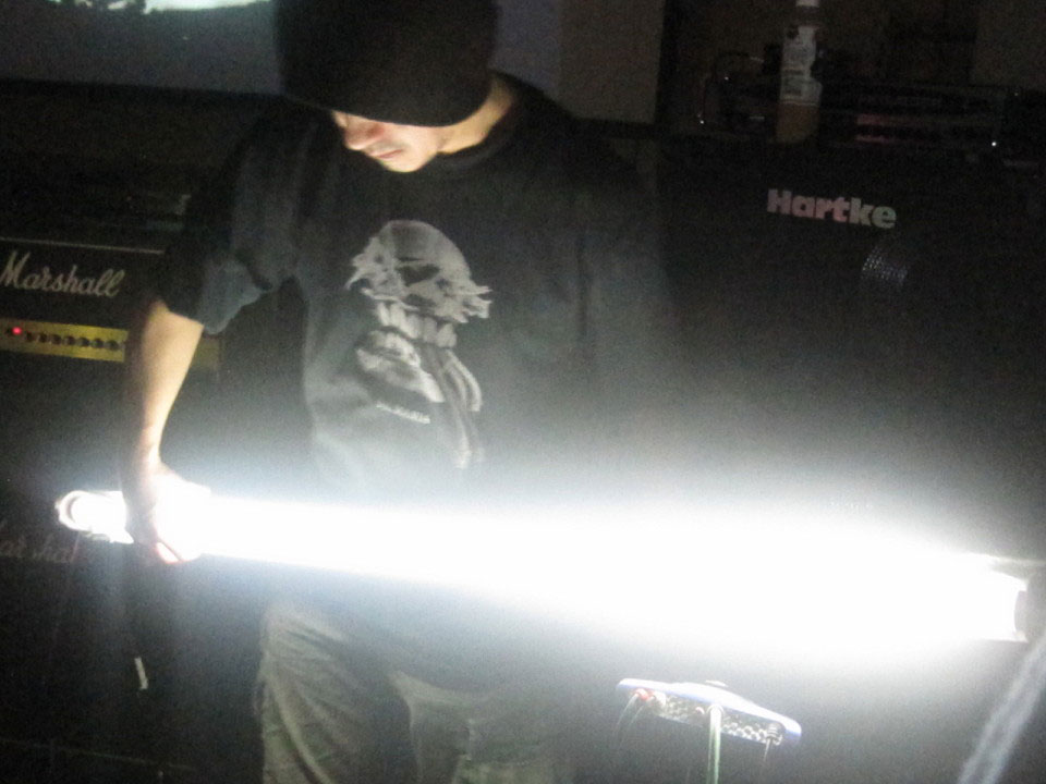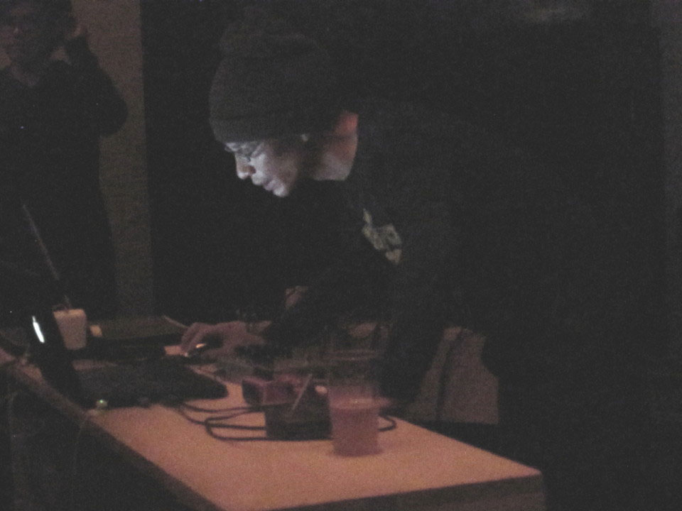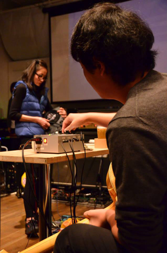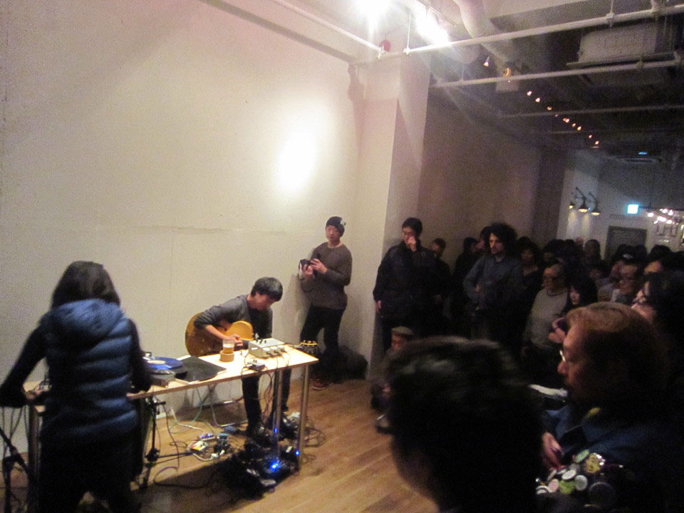 開演に10分程遅れて会場に着くと、何やら地響きのような音が漏れてくる。ギャラリーの奥に大道芸を見るような人だかりが出来ていて、強烈な重低音が会場を満たしている。人垣の頭越しに眺めると、フルアコを抱えた若いギタリストが座っている。彼がひとりでこの轟音を出しているのか、と思ったがどうも様子が違う。さらに奥に後ろを向いた女性が何かを抱えて身をくねらしている。最初短波ラジオか、と思ったらポータブル・レコードプレイヤーだった。男性はこのイベントの企画者の康 勝栄、女性は実験ターンテーブルユニットBusratchのメンバーだった毛利 桂。このイベントは組み合わせを変えてコラボレーションで演奏するスタイルである。会場の壁がマッサージ機のように震動する大音量にはさすがに階上の店舗からクレームがついたらしい。