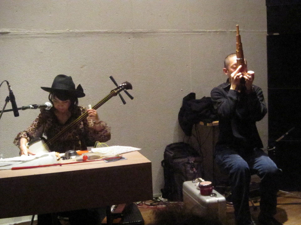 続いて和楽器デュオ。田中は坂田明の平家物語等で観た時は和服姿だったので、洋装が意外だった。三味線や大正琴を擦ったり叩いたりの変則奏法、ハチャメチャな義太夫節、急転直下の問わず語り、と目紛しくもユーモラスなパフォーマンスに観客から笑いも起る。対する石川はそれに動じない落ち着いた演奏で侘び寂びを体現する。雅楽のスタイルを借りたジャンルレスの即興パフォーマンスは、特に西欧人には興味深いだろう。
