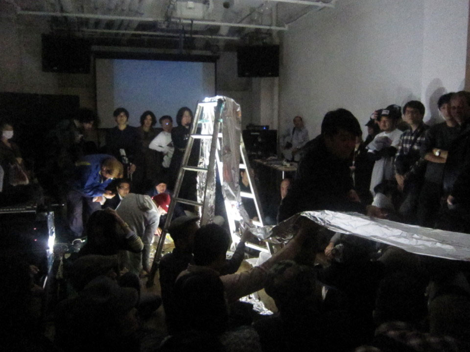 ギャラリーの真ん中に大きな脚立が設置される。取り囲む観客が見守る中、ふたりのパフォーマーが様々な物体(オブジェ)を床に広げる。川口はアルミホイルを客席に貼り巡らせ、電流を流すと言って脅す。大城はがたがた震動する機械やスピーカーを針金で脚立に繋ぐ。ストロボが点滅する中、淡々と作業が進み、川口が小型扇風機でアルミホイルを震わせ、脚立を逆さまにひっくり返す。さてこれから何が起るのかと期待していると、突然終了を告げる声。大掛かりなセットを用意して結局殆ど何も起らずじまい。川口のバイオグラフィーに書いてある通りの「無意味の集積物の様相」を呈していた。