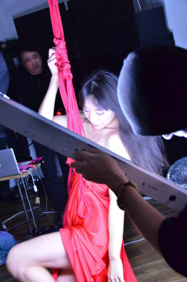 ヴィジュアル的に最大のハイライトとなるトリオ。ドラマー出身ヴィジュアル・コンピューター・アーティストのドラびでおこと一楽儀光は、音と映像を同時にコントロール出来る新世代楽器「DORAnome」を操り、パネルからカラフルな光を発する。伊東の蛍光灯を使ったノイズ発生器オプトロンも強烈な光を点滅させる。ふたりのライティング系演奏家に加え、ダンス・パフォーマーの若林がロープを使ったSM風エロチック・ショーを見せる。ドラびでお制作のあらゆる権威を罵倒するショッキングな映像もプラスされるので、見所だらけの盛り沢山なスーパー・ヴィジュアル・テロリスト・ショーだった。若林の艶かしい裸体だけでも充分過ぎる程刺激的なのに、強烈なノイズと明滅する光の放射で頭がクラクラする。頭の中に10数年前に多数の失神者を出し社会問題になったポケモンショックがフラッシュバックする。