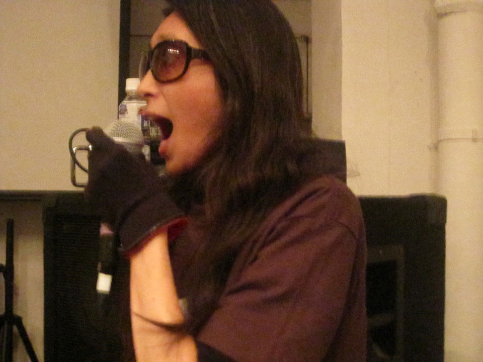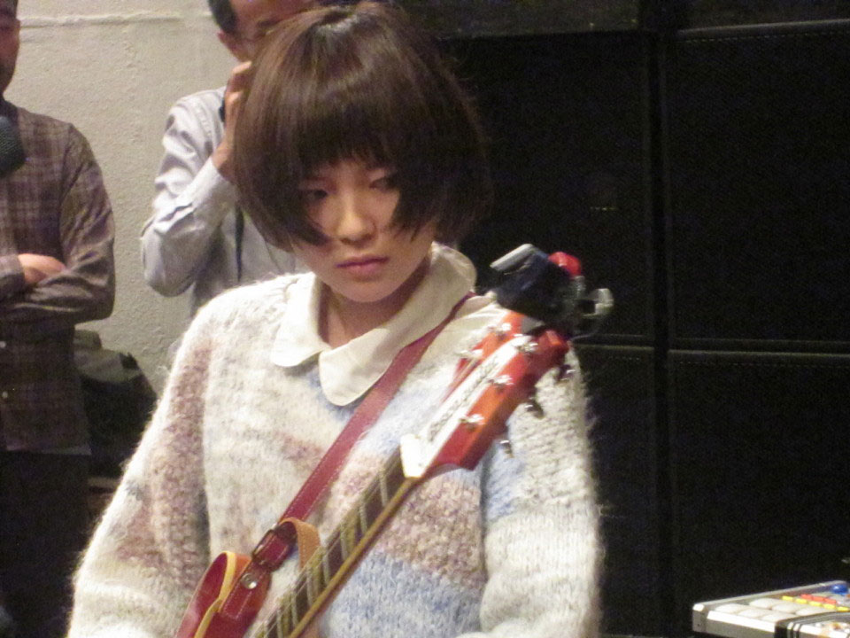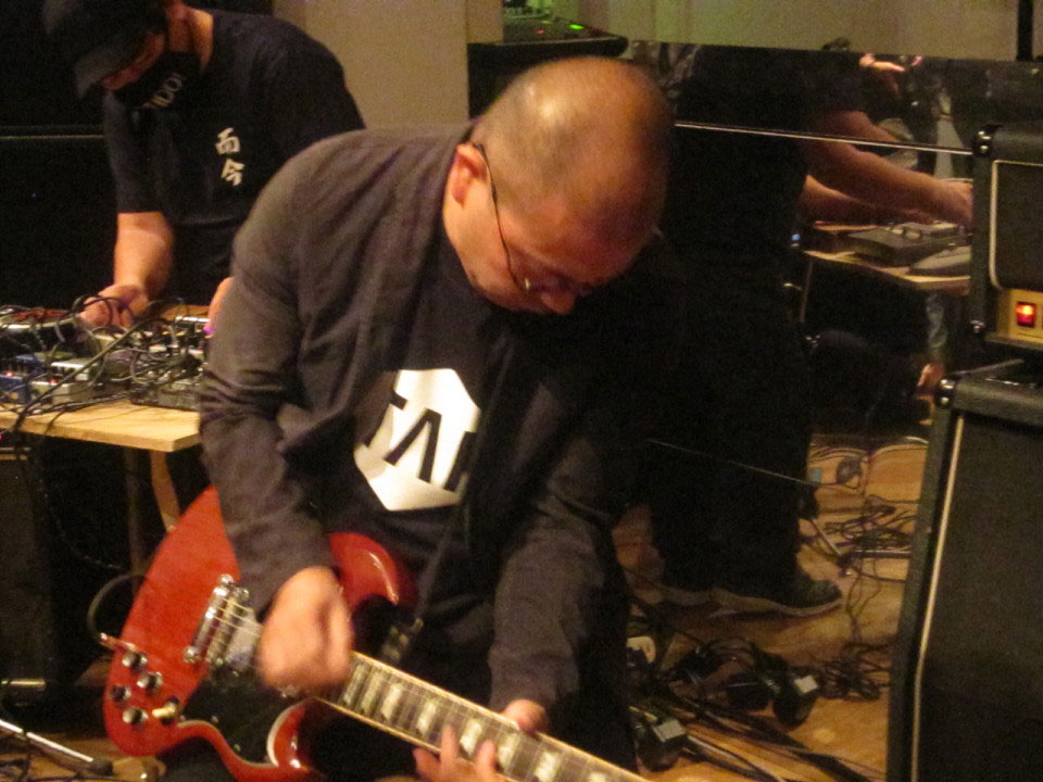 先ほどから満員の観客の中に、この場に似合わぬ幼い顔の少女が交じっていて、原宿ガールがノイズを聴きに来るとは時代も変わったな、と感慨にふけっていたら、その娘がギターを抱えて出てきたので驚いた。この日は出演が無かった初音階段で初音ミクのコスプレで歌う白波多カミンが、素顔に普段着で非常階段に参加。昨年秋に大阪でJOJO広重と共演したのがカミンのノイズ初体験だった。その時の感想をカミンは「とてもセクシーな気分」と記している。以降初音階段に留まらぬ共演を重ねるのは、セクシーな気分が今も続いているからだろう。自分の両親と同世代のベテランと対等に渡り合うカミンの成長(逸脱?)ぶりは著しい。広重、JUNKO、美川の三人にとっても、若い感性から刺激を受けることは間違いない。それを証明するかのように、最近ではピカイチのストロング・スタイルのステージだった。