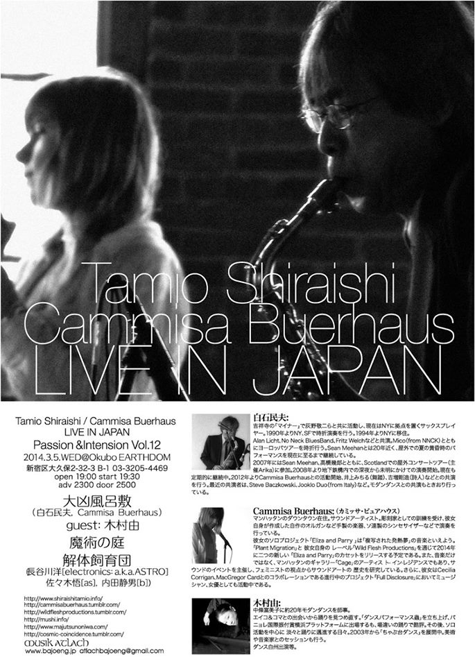 2012年にフェミニスト/彫刻家/女優/サウンドアーティストである若き才女、カミッサ・ビュアハウスと出会い意気投合しデュオとして活動をはじめる。以来、詩人の吉増剛造と共演するなどユニークな活動を繰り広げてきたふたりが「大凶風呂敷」というユニット名で来日し、全国5ヶ所で新旧アーティストとの共演/対バン・イベント公演を行った。