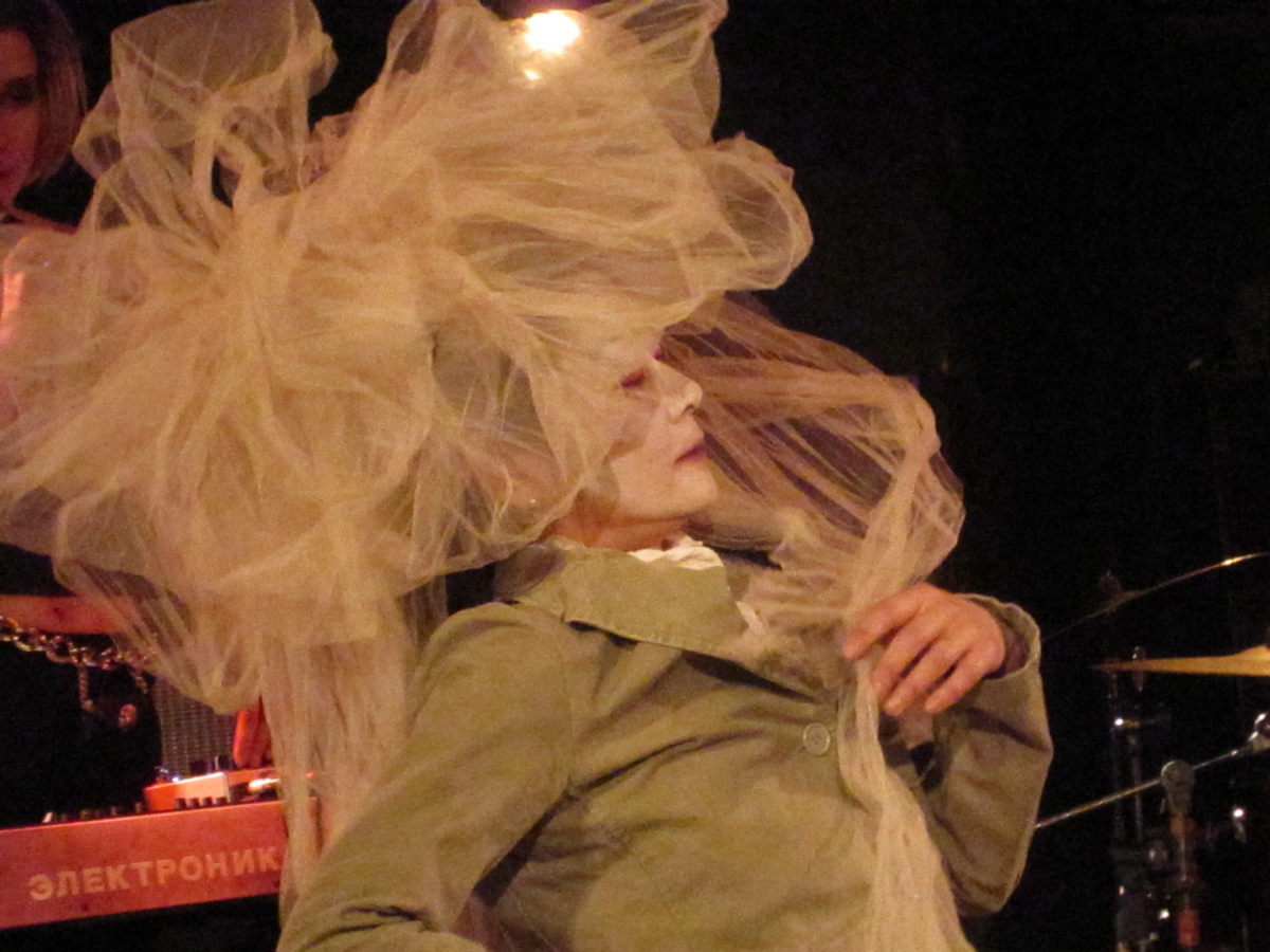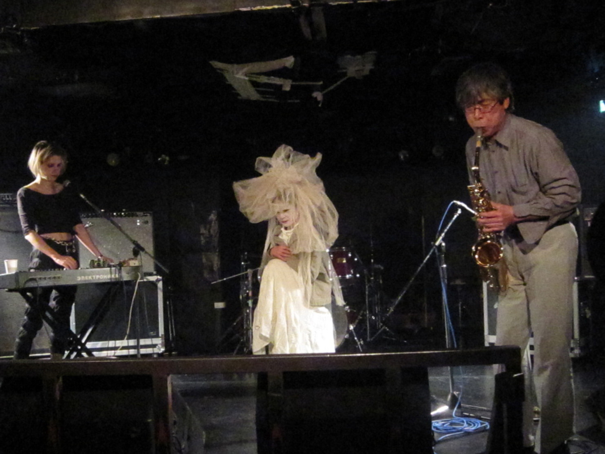 白石民夫がゆっくりとアルトのマウスピースを銜えて、細い高周波音を絞り出すように紡ぎ出す。空気の狭間に真空を生じるような、居合い抜きの気迫に満ちた音。カミッサ・ビュアハウスは愛用のソビエト製シンセから鈍い波形の電子音をたぐり出し、ふたつの音は付かず離れず浮遊する。白いレースのリボンに包まれた木村由の肢体がゆっくりと舞い、スローモーション映像で想像力を喚起する。聴覚と視覚と知覚への刺激は、氷のように冷たく、同時にマグマのように熱い。客席後方に移動した白石の引き裂くハイトーンが背中に突き刺さる。木村も客席に降りて目の前で舞う。遠近感が暮夜けて超現実的な光景を描き出す。透徹したクールネスに貫かれたパフォーマンスは、前2者の地獄のような轟音に痛めつけられた耳の傷跡を癒す潤いをもたらした。