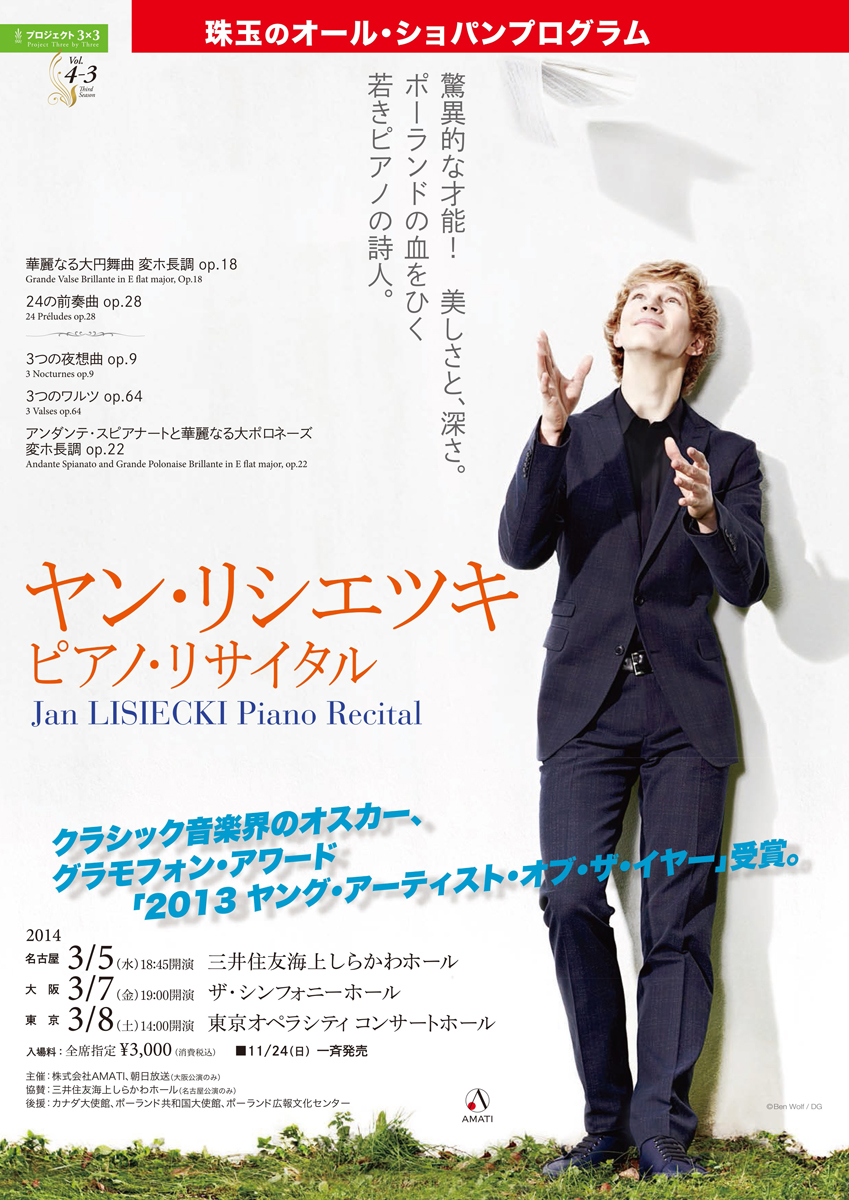 ティーン・エイジの持つ柔らかな感性をすみずみまで行きわたらせた、みずみずしいショパンだった。ポーランド人の両親をもつカナダ生まれの18歳。9歳でオーケストラ・デビュー、15歳でドイツ・グラモフォンと録音契約、2013年にはクラシック音楽界のオスカー、グラモフォン・アワード「2013ヤング・アーティスト・オブ・ザ・イヤー」受賞という経歴。その実力に加え、細身でさわやかな風貌、アンコールの拍手に応えての「アリガトウゴザイマス」のユーモアたっぷりの挨拶と、ファンの急増、間違いなしの新星である。