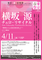 横坂源が出光音楽賞を受賞したのは確か18歳のときだったと思う。先にFM放送で聴いたエルガーのコンチェルトも例外ではないが、あれから10年近くを経て将来の日本のチェロ界をになう逸材としての成長を遂げつつある演奏に触れて頼もしい限り。(なお、このリサイタルは10周年を迎えた『東京・春・音楽祭』の一環としておこなわれた)。(悠 雅彦)