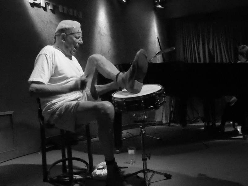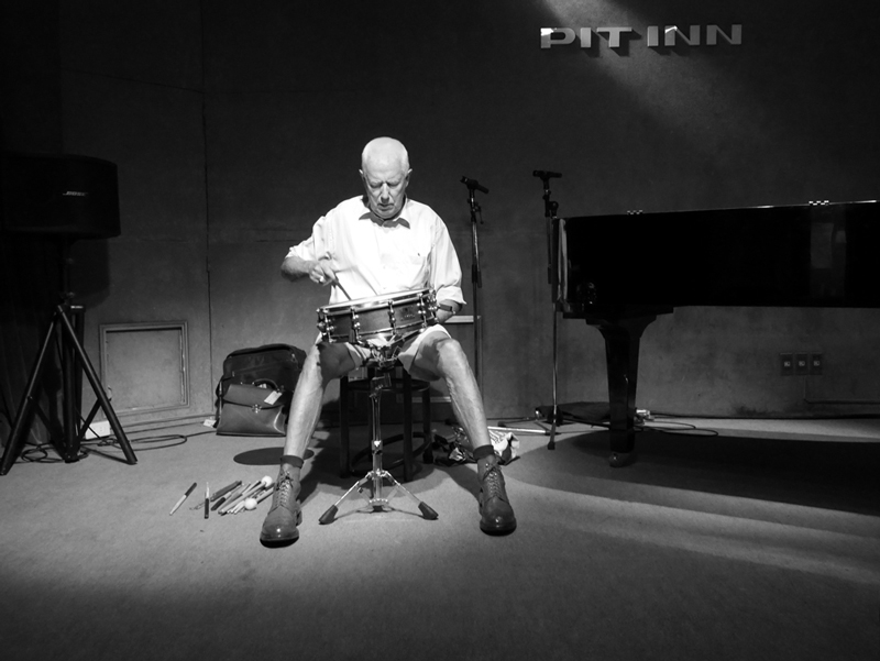 ハン・ベニンクがミシャ・メンゲルベルクとICP(インスタント・コンポーザーズ・プール)の実験を開始したのが67年ごろ。1970年5月に訪欧したとき、ヴィレム・ブレゥカー(当時はウィレム・ブロイカーと表記していた)のエスコートでアムステルダムのライヴハウスを訪ね歩き、その1つでベニンクの演奏を聴いた私にとっても、あるいは伝説的ドラマーたらしめたエリック・ドルフィーの『ラスト・デイト』(64年)の愛聴者としても、ハン・ベニンクの名を忘れることはできない。とはいえ、それから約半世紀を経てなお、70を越えた彼が往年を彷彿させるプレイで変わらぬ健在ぶりを示してくれるかどうかが私の最大の関心事だった。だが、心配無用とばかり、ベニンクはスネアドラムたった一体を自在に操り、横井一江著『アヴァンギャルド・ジャズ』(未知谷)のオランダの頁に掲載されている、スネアドラムにのせた左足でスティックによるサウンドに変化を生む彼の姿を捉えた写真同様のプレイを、まるで玩具に戯れる幼児のように発揮してみせた。のみならず、スネアドラムから離れて床や目に入るさまざまな物体を叩いて音を出しながら冗長に堕すことはなく、高瀬が演奏を終わろうとするところを決して踏み外さない機転の利いた臨機応変のプレイで対応するのだから、ドラマーとしてさすがヨーロッパの即興音楽の牙城を築いてきた人だけのことはある、と改めて感心した。