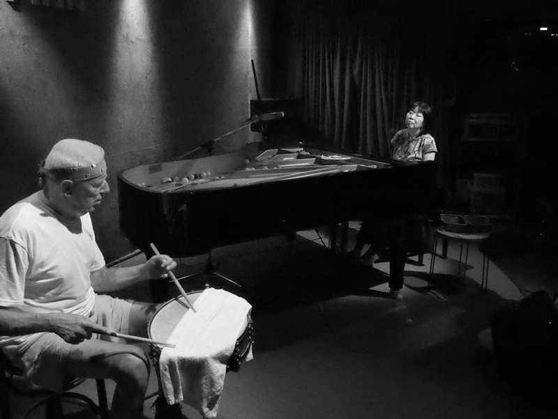 今年の相手はハン・ベニンク。とはいっても味のある対話となるか、それとも予期せぬ激烈な一騎打ちとなるか、まったく予測がつかない。演奏前の挨拶で高瀬は言った。「私は過去にクラリネットのルイス・スクラヴィスや夫のシュリッペンバッハをはじめ色々なプレーヤーとデュオ演奏を試みてきました。いまやりたいプレーヤーはドラマー。ところが私はドラマーとのデュオ演奏をしたことがありません。もし組むんだったらハン・ベニンクしかいないと思っていたんです。そしたら彼がICPの一員で来日すると聞きましてね、これぞ千載一遇の機会だと思ったわけです」。