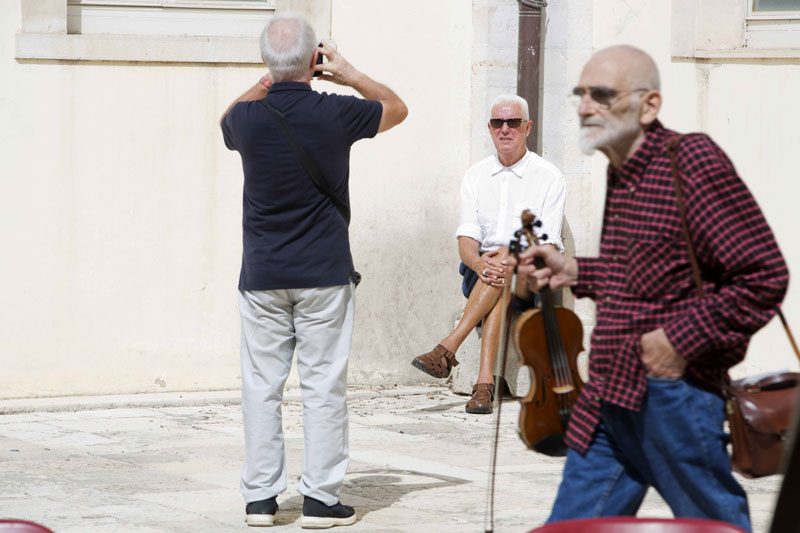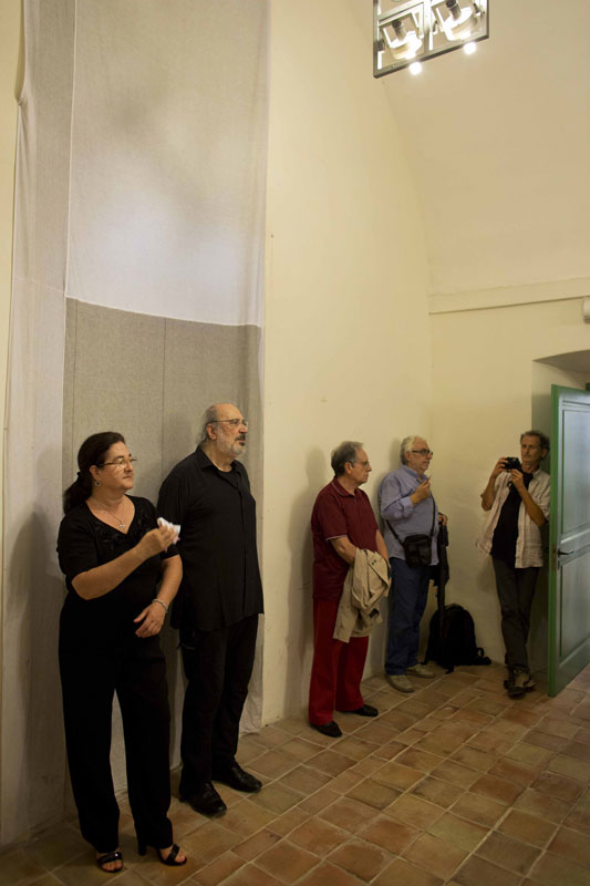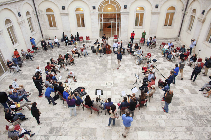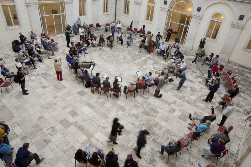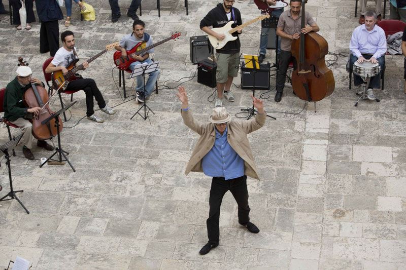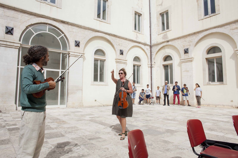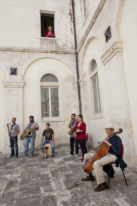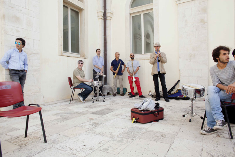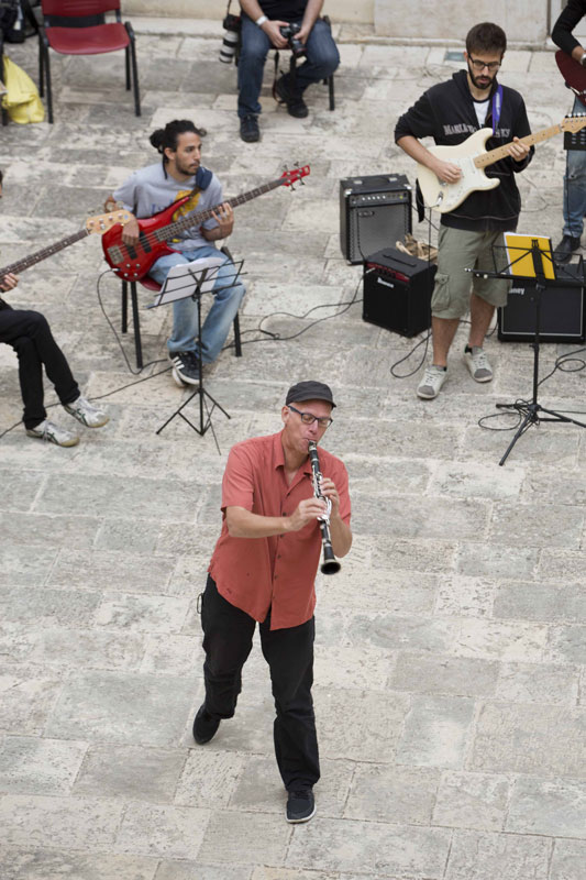 それぞれのストーリーについては幸い写真が多くを語ってくれるだろうが、ルーヴォの行政当局の文化担当官パスカーレ・デ・パロの深甚なるサポートを得てこのフェスティヴァルを存続、再開させるために果たしたピノ、息子のリヴィオ、マルゲリータ・ポルフィード夫人、母親から成るミナフラ・ファミリーの情熱と頑張りについては私の口から直接お伝えすべきだと思う。じつを言うと、ジァンルイージ・トロヴェージのクラリネットとのデュオ・コンサートでハープシコードを演奏、ダンス公演の幕を開けたのもマルゲリータ夫人だった。このコンサートは未発表の新曲で構成されサプライズの連続だったが、とても趣味の良い内容でもあったのだ。残念だったのは、雨天のためパラスポートという音楽にはふさわしくない施設での演奏を余儀なくされ、残響が大きいため、いつもは明晰なキース・ティペッツのソロも犠牲になってしまった。フランク・ザッパを演奏したタンキオ・バンドもひどいアコースティックに悩まされたのは言うまでもない。