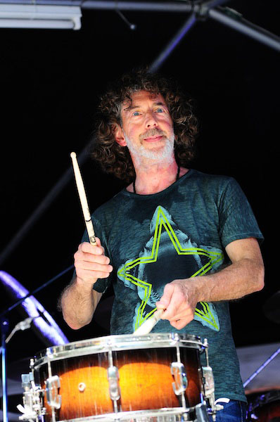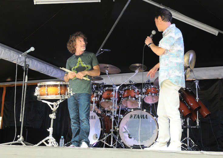 「the PLAZA Main Stage」では、11:45からサイモン・フィリップス・ドラム・ワークショップ。上原ひろみ ザ・トリオ・プロジェクトで来日している。限られた時間なのでと前置きして、本番前の楽屋で、ホテルの部屋で実践しているというウォーミングアップ、基礎練習を教えてくれるという。スネアドラムのみを使い、いずれも単純なものから始まり、しかしテンポを少しずつ速めとんでもないことに、そして右手と左手のコンビネーションも次第に複雑になる。自身のバンドで、TOTOで、上原ひろみとともに、生み出される正確で繊細なリズムはこうして生み出されるのか。そしてツインバスドラムのフルセットでのすばらしいデモ演奏、アマチュアのドラマーが多いと思われる観客から大きな歓声があがった。