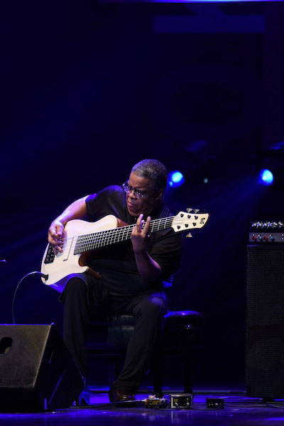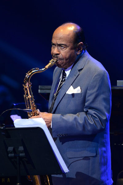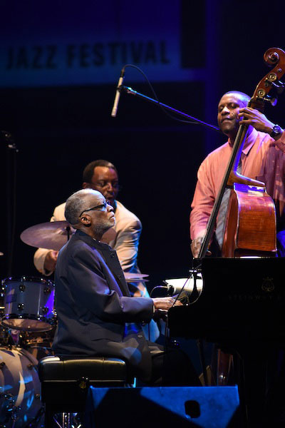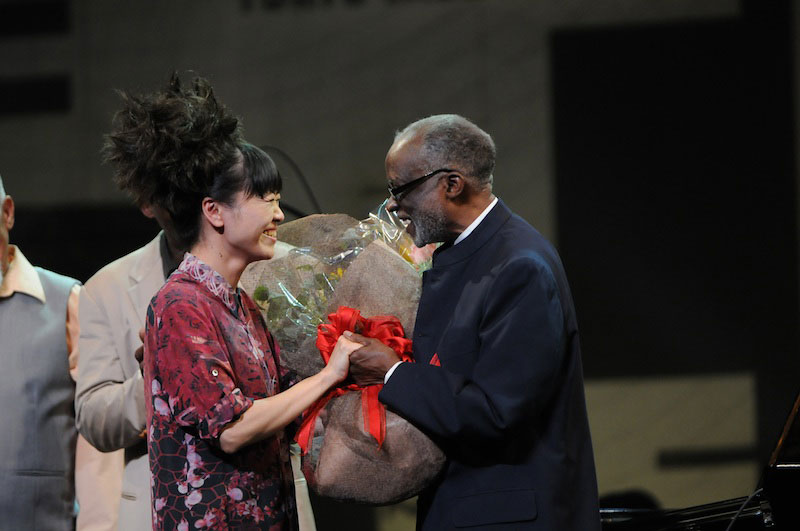 最終公演となる日曜夜の部は、アーマッド・ジャマルから。今回、ベニー・ゴルソンに次ぐ最高齢の84歳。これまで生で聴く機会はなかったが、マイルス・デイビスが尊敬し、影響を受けたという存在としてずっと気になっていた。ただ、コットンクラブでのバティスト・トロティニョンに長居してしまって、明確にお伝えできるほどアーマッドをじっくり聴くことができなかったので、前号に掲載された悠 雅彦主幹のレポートをぜひご参照いただきたい。ただ、演奏における間の感覚などは、確かにマイルスのアプローチに通じる点はあるかも知れないと感じた。バークリー音楽大学在学中だった上原ひろみを見いだし、『Another Mind』をプロデュースしたのがアーマッドだったというご縁があり、ひろみからアーマッドへ花束が贈られたのも印象的だった。現在のひろみの世界的な活躍を見ればアーマッドがいかに的確だったかがわかる。2012年にはグラミーにノミネートされた『Blue Moon』、2013年には『Saturday Morning』をリリースと、アーマッドの創作活動は精力的に続く、活躍とまたの来日を楽しみにしたい。