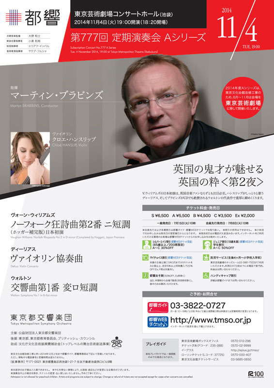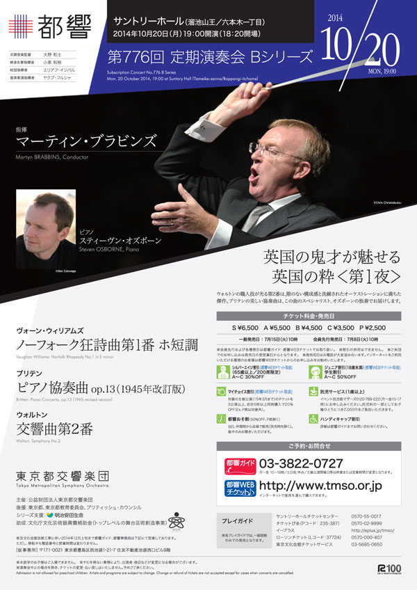 今回のブラビンズ指揮による第776回、第777回の定期演奏会はイギリス音楽ファンには聴き逃せない回である。ヴォーン・ウィリアムズ、ブリテン、ディーリアス、ウォルトン。日本のコンサートではなかなか演奏されない作曲家とその楽曲ばかりで構成されたコンサートであった。ここでは776回をメインにレポートする。