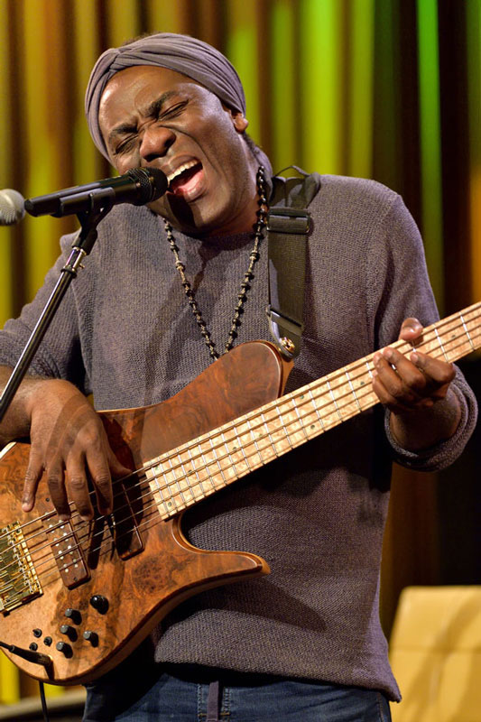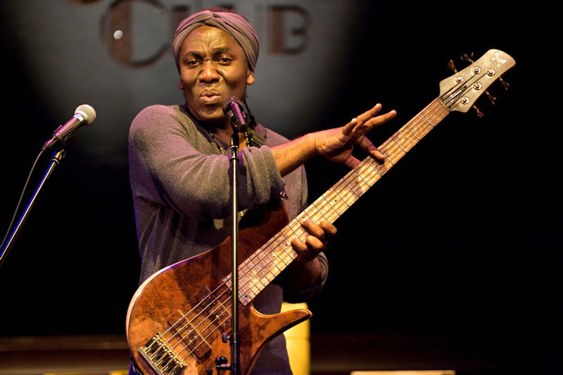 ソロ・アーティストとしてのボナは、今やトップ・ベーシストというだけでなく、アフリカン・ポップスを代表するスター。ライブ冒頭から、真っ先に耳に飛び込んでくるのは、母国カメルーンのドゥアラ語による美しい歌声だ。ほどなくして、それがとんでもないベースラインを弾きながら発せられていることに気付いて呆気にとられるのだが、そのぐらいで驚いてはいけないのだろう。文字通り一体化した声とベースが生み出すグルーヴは、唯一無二と言っていい。