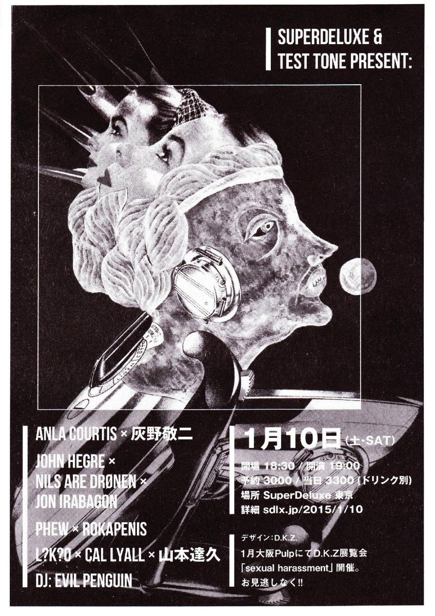 そのひとつが「東京の不定形な芸術、音楽、パフォーマンスを毎月提供する実験室」をコンセプトとする入場無料のシリーズ・イベント「TEST TONE」だった。2005年から2014年までの9年間開催され、出演アーティスト数は500組に上る。殆どのパフォーマンスがこのイベントだけのスペシャル・セッションで、意外性のある組み合わせが生み出す創造性はまさに「実験室」と呼んでいい。2014年1月の100回目3daysで終了した「TEST TONE」の名前が、スーデラ2015年ライヴ営業初日イベントで復活したことは、どの出演者もメインアクト級の豪華大盤振る舞いのお年玉企画に相応しい。