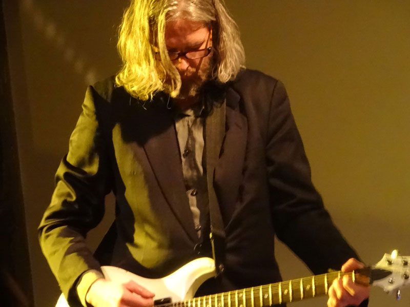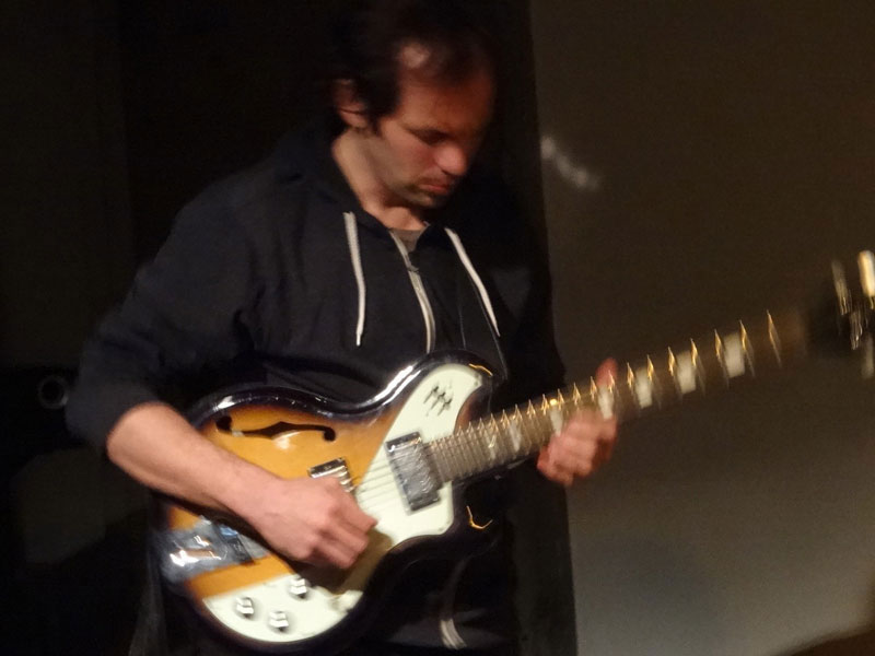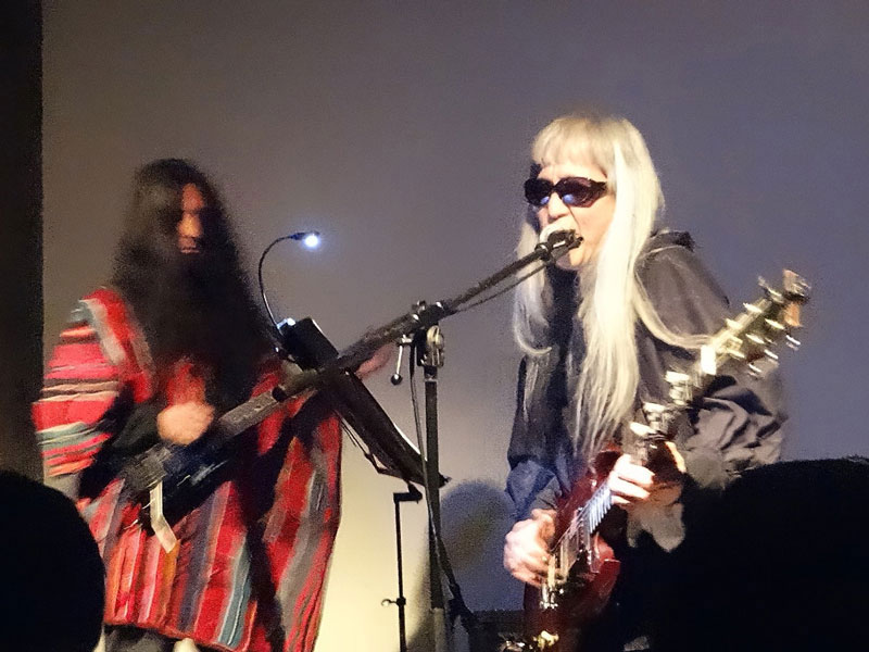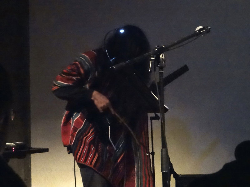 アンラ・コーティスは、アルゼンチンのエクスペリメンタル・サイケデリック・ロックバンド、レイノルズの創設メンバーとして、90年代前衛ロック・シーンで名を馳せた。ソロとしても多彩な活動を行い、何度も来日し日本のミュージシャンとの共演も多い。2011年の来日時に、しきりに灰野敬二に会いたいと語っていた。その願いが叶って今回初共演が実現。右に灰野、左にコーティス。灰野が最近愛用する電気増幅スプリングの爆音ノイズとコーティスのフィードバック・ギターでスタート。続くギター・デュオ演奏では、激しいアクションで切れ味のよい轟音を掻き鳴らし、英語で自らの詩を歌う灰野に対して、コーティスはフォルクローレ・マントを纏って影のように舞いドローン演奏を繰り広げる。いつもは闇に立つ灰野にライトが当たり、カーニバル好きのアルゼンチン人が暗黒に隠れるという逆転劇は、血の臭いが漂う歓びの謝肉祭だった。