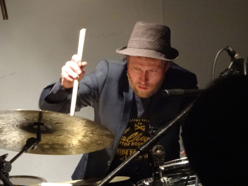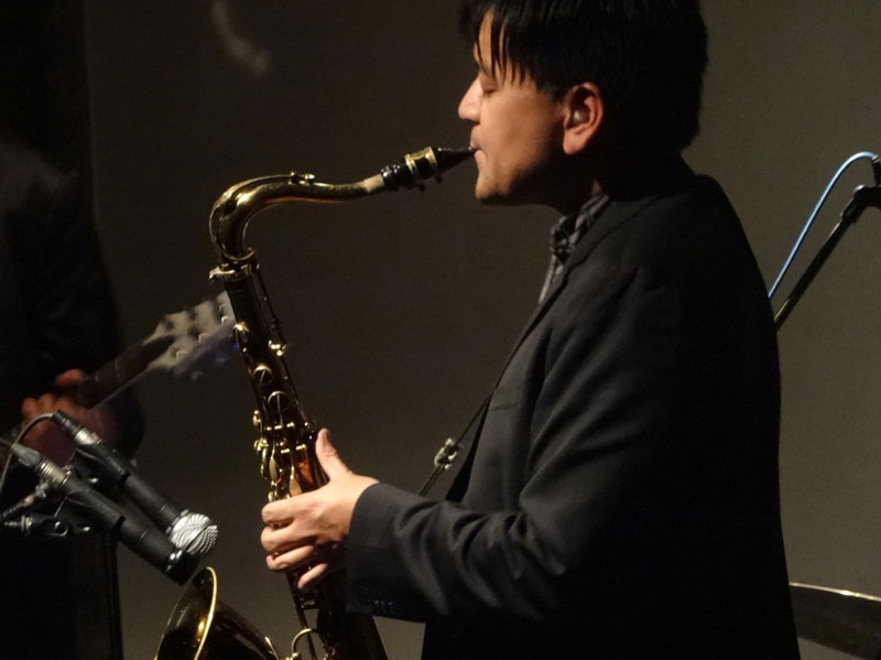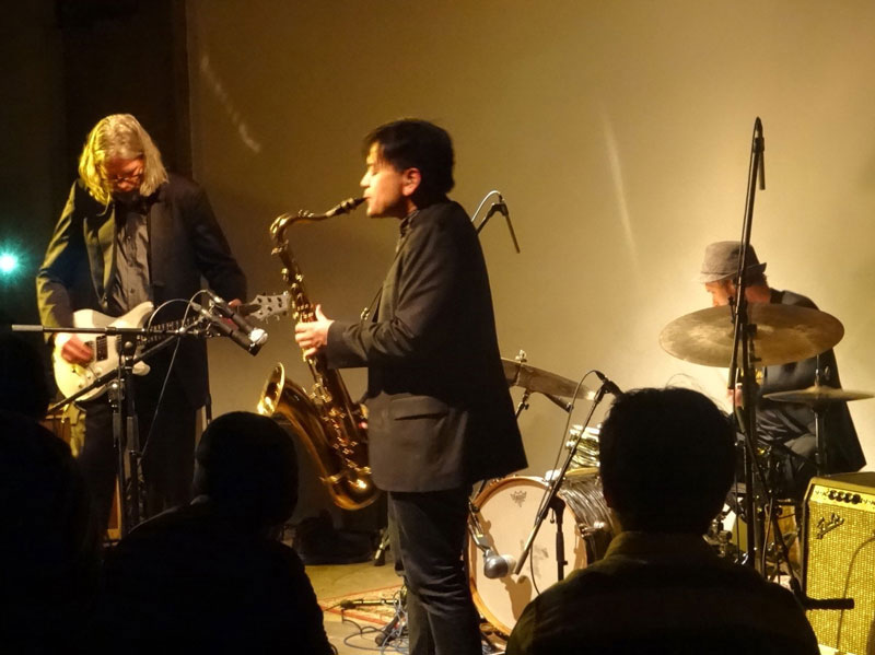 ノルウェー・ノイズ・ミュージックの代表格ジャズカマー(Jazkamer)のギタリストJohn Hegreと、ジャズカマーにもゲスト参加するドラマーのNils Are Dronenは1996年からPublic Enema名義でデュオ活動する。その音楽性はハイ・エナジー・フリー・フォームと呼ばれる激烈なもの。今回の来日に同行したのは、ニューヨークを拠点に活躍している実力派サックス奏者ジョン・イラバゴン。JazzTokyo Five by Five # 1161で細田成嗣氏が紹介したNYの個性派ジャズ・グループ、モストリー・アザー・ピープル・ドゥ・ザ・キリングのメンバーでもある。最近は伝説的ドラマー、バリー・アルトシュルとのトリオでの活動も報じられるNY即興シーンの闘士イラバゴンと北欧ハードコア・デュオとの邂逅が生み出したダイナミックな非ジャズ即興は、異能音楽愛好家が集う地下倶楽部を白夜の激情で焼き尽くした。