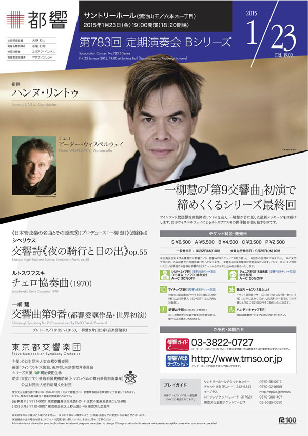 プログラムのトリから書いて行ったが、前半はシベリウスとルトスワフスキ。いわば一柳作品の源流である(ちなみに、シベリウスのこの楽曲はまるで後のミニマルミュージックのようだし、ルトスワフスキは一柳作品にも用いられた「管理された偶然性」が取り入れられている。既にこんなことをしていたのだ)。この選曲について、一柳曰く「大国に挟まれた小国−フィンランド、ポーランド−の厳しい境遇、立場は違っても過酷な状況に置かれた第2次世界大戦時の日本に通じるものがある」。シベリウスではリントゥの指揮が冴え渡っている。オケを完全に統制し、いわゆる有機的展開のないこの楽曲を終始緊張感に溢れた形でまとめ上げていた。まるで緩みがない。今年の秋にも来日してシベリウス・ツィクルスを行なうリントゥ、大いに期待できそう。次のルトスワフスキは、はっきり申し上げればこの日のコンサートの白眉だろう。驚くことに、チェリストのウィスペルウェイはこの難曲を暗譜で弾いた。また、演奏への没入ぶりからは、単に暗譜をしているという次元をはるかに超越して、楽曲が完全に血肉化されているのがありありと見て取れる。その凄まじいパフォーマンスにホールからは圧倒的な喝采が湧き起こる。楽員も打ちのめされている様子である。アンコールで、ウィスペルウェイはルトスワフスキ冒頭で何度も繰り返されるD音を再び弾き始める。ホールからはざわめきが起こり(「またルトスワフスキ!?」)、これを何度か繰り返したところで同じD音から開始されるバッハの『無伴奏チェロ組曲第2番』にシームレスに移行。素晴らしいユーモア。こちらもセンス満点の繊細かつ大胆な名演だった。