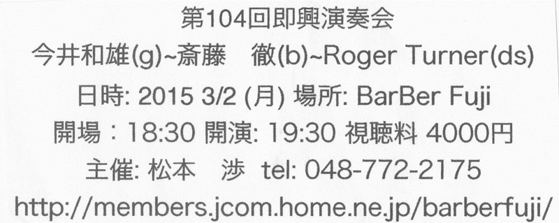 「バーバー富士」で、今井和雄(g)齋藤徹(b)ロジャー・ターナー(ds)という素晴らしい組み合わせのセッションがあるというので、駆けつけた。「バーバー富士」については、ネットなどで目にはしていたが、実際に行ったのは今回が初めてだった。高崎線大宮駅から2つ目、上尾駅から徒歩10分弱の静かな住宅街にある床屋さん。理容椅子2脚のそう広くはないお店で、すでに100回を超える即興ライヴ(自宅ライヴ)が行われているという。