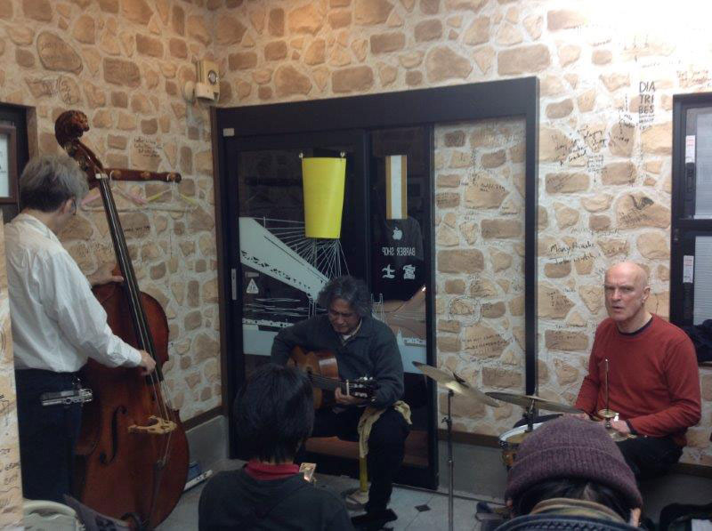 バーバー富士のHPによると、1988年5月のルー・タバキン〜デイヴ・ホランドを皮切りに、レオ・スミス、バール・フィリップス、ミッシャ・メンゲルベルク、ポール・ラザフォード、ペーター・ブロッツマン、イレーネ・シュヴァイツァー、姜泰煥、ルイ・スクラヴィス、ローレン・ニュートン、ジョン・ラッセル、ジョン・ブッチャー、日本人では豊住芳三郎、齋藤徹をはじめ、梅津和時、翠川敬基、高木元輝、灰野敬二、広瀬淳二、内藤和久、板橋文夫、板倉克行、今井和雄、林栄一など、内外の即興演奏のそうそうたるメンバーが顔をそろえている。そして今回の今井〜齋藤〜R.ターナーによる即興ライヴで104回目をむかえた。27年間継続してき力、その強い信念はどこから生まれてきたのか…。お店のオーナーで主催者の松本渉さんに聞いてみた。