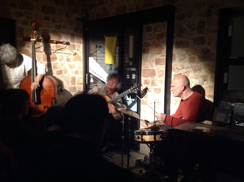 スネア1つにシンバル2つ、小さなハイハットというターナー、まるでムダを極限までそぎ落としたシンプルなスタイルだ。まったくアコースティックな演奏の中、ギターやベースの音がきれいに立ち上がり、それぞれの音がかき消されることがない素晴らしいバランスが保たれていた。百戦錬磨、世界各国のミュージシャンとの即興演奏やミクスドメディアとのパフォーマンスを渡り歩いてきた達人の制御された繊細なプレーが感じられた。