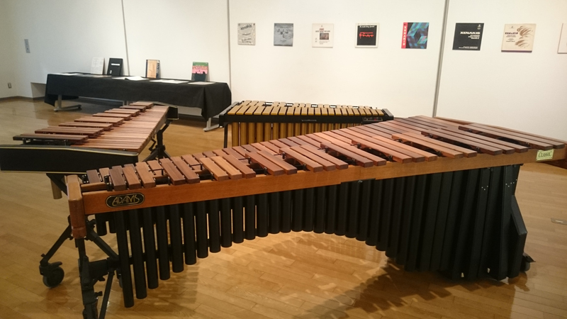 会場のある相模湖交流センターは、外見は何の変哲もないこじんまりとした町役場、といった風情。開演よりかなり前に到着、あらかじめ電話にて予約しておいたチケットを窓口で受け取って左手に進むと、ギャラリーもしくはミーティングルーム的な部屋があり、そこにはマリンバ、シロフォン、ヴィブラフォン、さらにはクセナキスが『プレイアデス』のために考案した楽器「ジクセン」もある(最初はここで演奏するのか? と訝った)。壁やテーブルにはかなりレアと思われるクセナキスの様々なLPレコードやCDも展示されている(筆者も所有しているアイテムがかなりありました)。最も奥にはLINNのオーディオ装置もセッティング(音は聴いていません)。この部屋には加藤訓子ご本人もいらして関係者の方と談笑されている。しばらく見て回った後に一旦センターを離れる。外で食事と散歩の後開場時刻に舞い戻ってみると、演奏会場は同じ建物の別の場所であった(一安心)。こちらがホールである。相当に暗い会場の中、中央天井からスクリーンが張られ、そこには<PROJECT IX XENAKIS>の文字が投影されているが、これは背後の壁面にも透かされて写っており、つまり二重になっている。会場中央には縦に細長いスピーカーが6本セッティングされており、それが取り囲むように様々なパーカッションが設置されている。事前のチラシや案内には、6人のパーカッション奏者が必要な『プレイアデス』をどういった形態で聴かせるのかの記載が全くない。加藤がどれかのパートを演奏し、残りは同じ会場でレコーディングされてLINNレーベルより発売されている同曲のマスター音源を会場に流すのだろうか、などと考えている中に加藤が登場。少し「前説」を行なった後に一旦退場されたのだが、改めて出て来るのだろうかと思っていると前述のスピーカーから凄まじく高音質の『プレイアデス』が流れ出す。つまりは、加藤が演奏した録音をそれぞれ6本のスピーカーから再生し、そこにサウンドインスタレーションと称してアブストラクトなデザインの模様、または合成された6人の加藤の映像が流されるという趣向だった訳だ。その度肝を抜かれるような、体ごと音圧で吹っ飛ばされそうになるような凄まじい音響は、もはや聴くものではなくてその場で「体感」するものとしか言いようがない。微妙に音程や音色の違った楽器が組み合わされることにより、単体としてはそれなりに耳馴染みがあると思っていたそれぞれの楽器が何とも形容し難い不可思議な音響世界を現出させる。このような音は聴いたためしがない。かてて加えてリズムの嵐。最初こそは「プレイアデスでは加藤さん出ないの?」などと考えていた筆者は曲が進むにつれてそんな考えは木っ端微塵に粉砕させられていた。思えばこのような最高の音響条件で『プレイアデス』を再生することなんぞ出来はしまい。その意味からもこれは唯一無二の体験であった。
